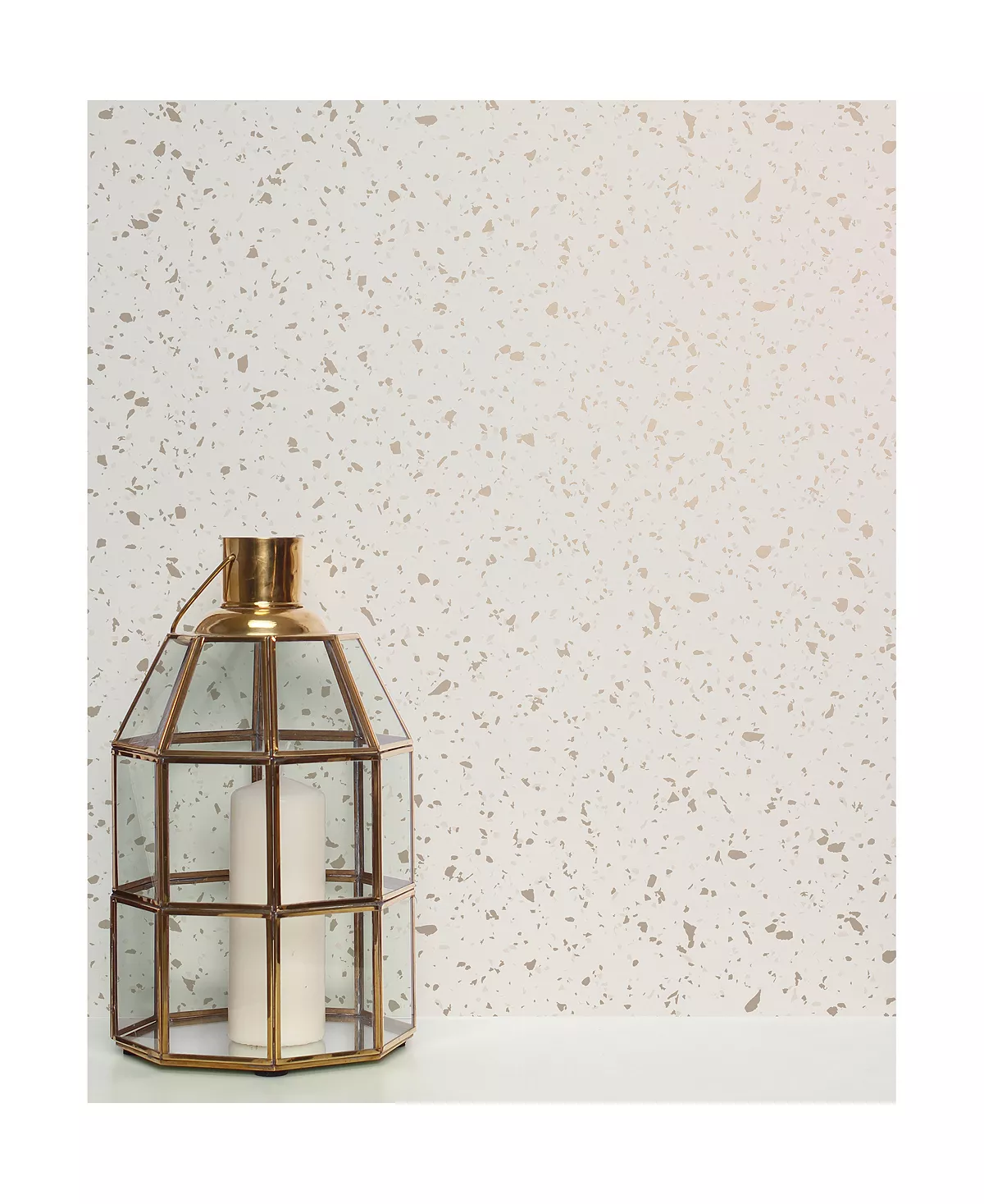 Reminiscent of a terrazzo floor, this speckled wallpaper has a sophisticated style. A rich cream background and bronze flecks create a chic, organic design. Arendal is an unpasted, non woven wallpaper.