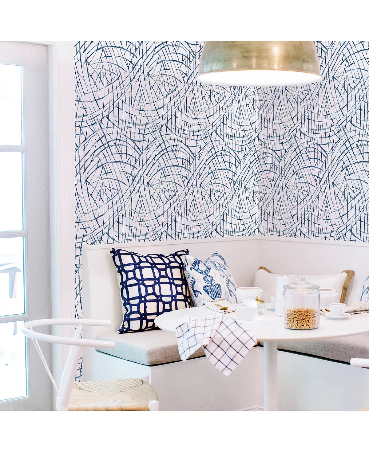 Breathe a new life into walls with this intriguing and exiting design. Blue brushstrokes leap across a white background, creating an abstract print with a dimensional effect. Willy nilly is an unpasted, non woven wallpaper.