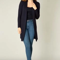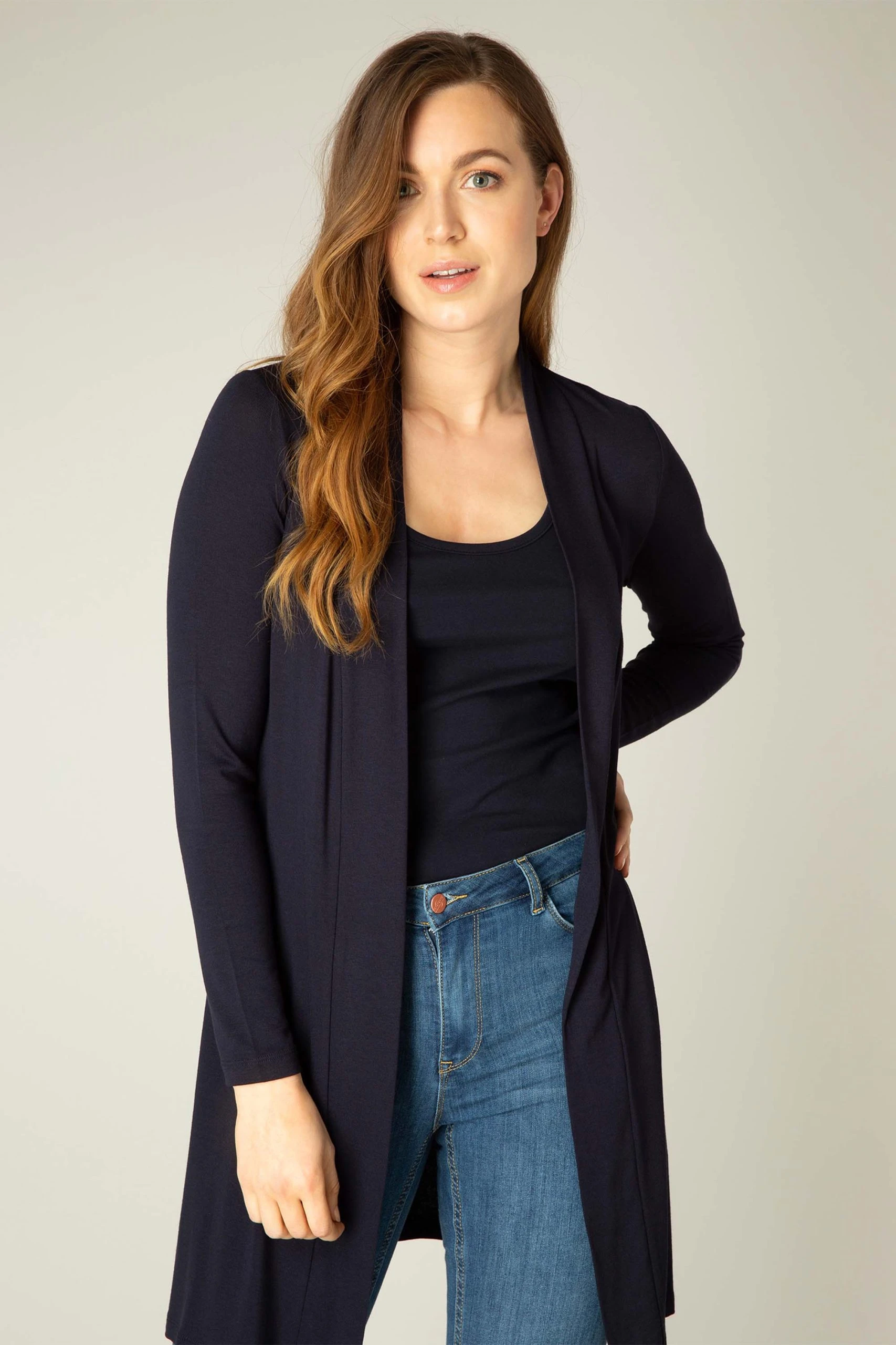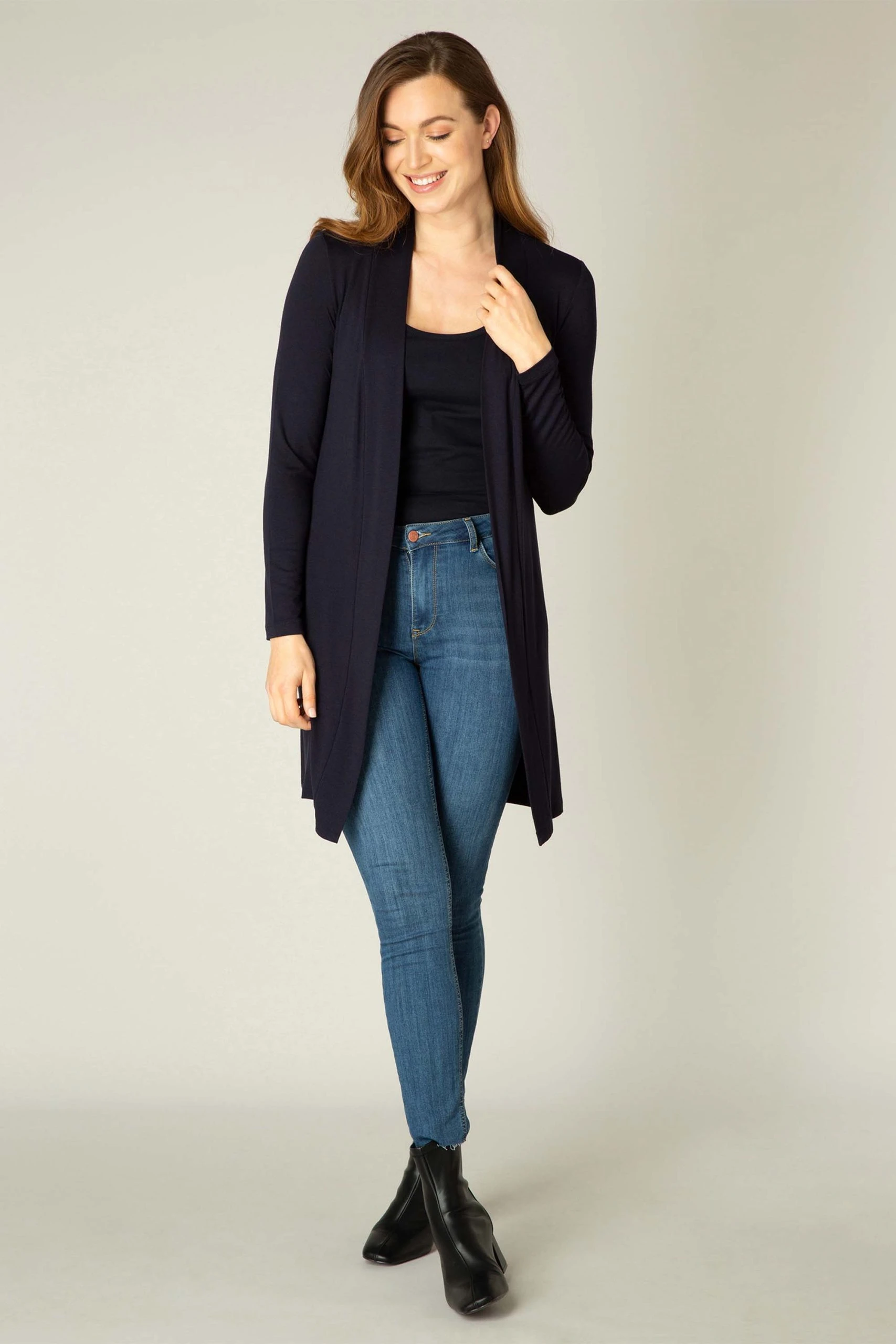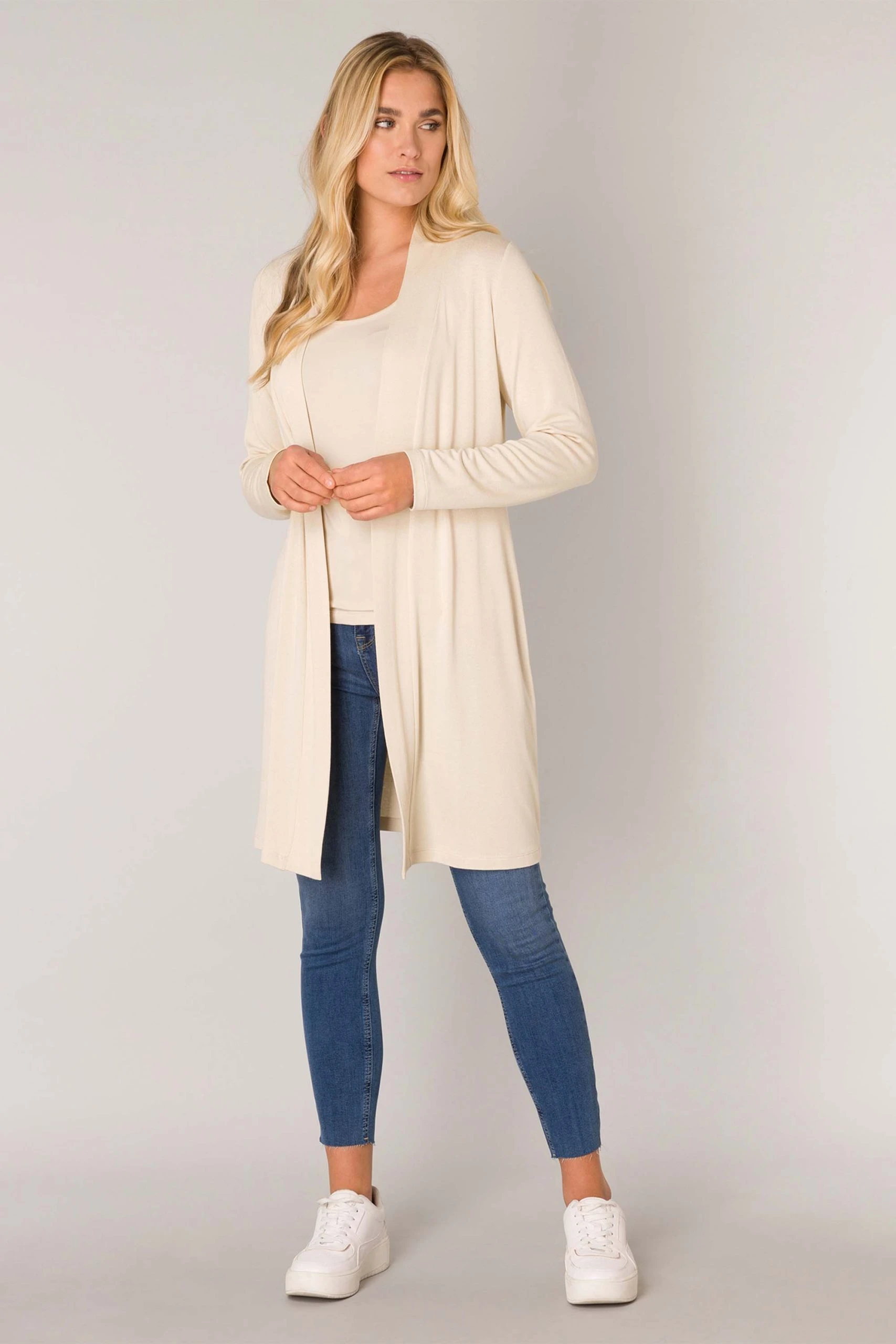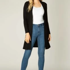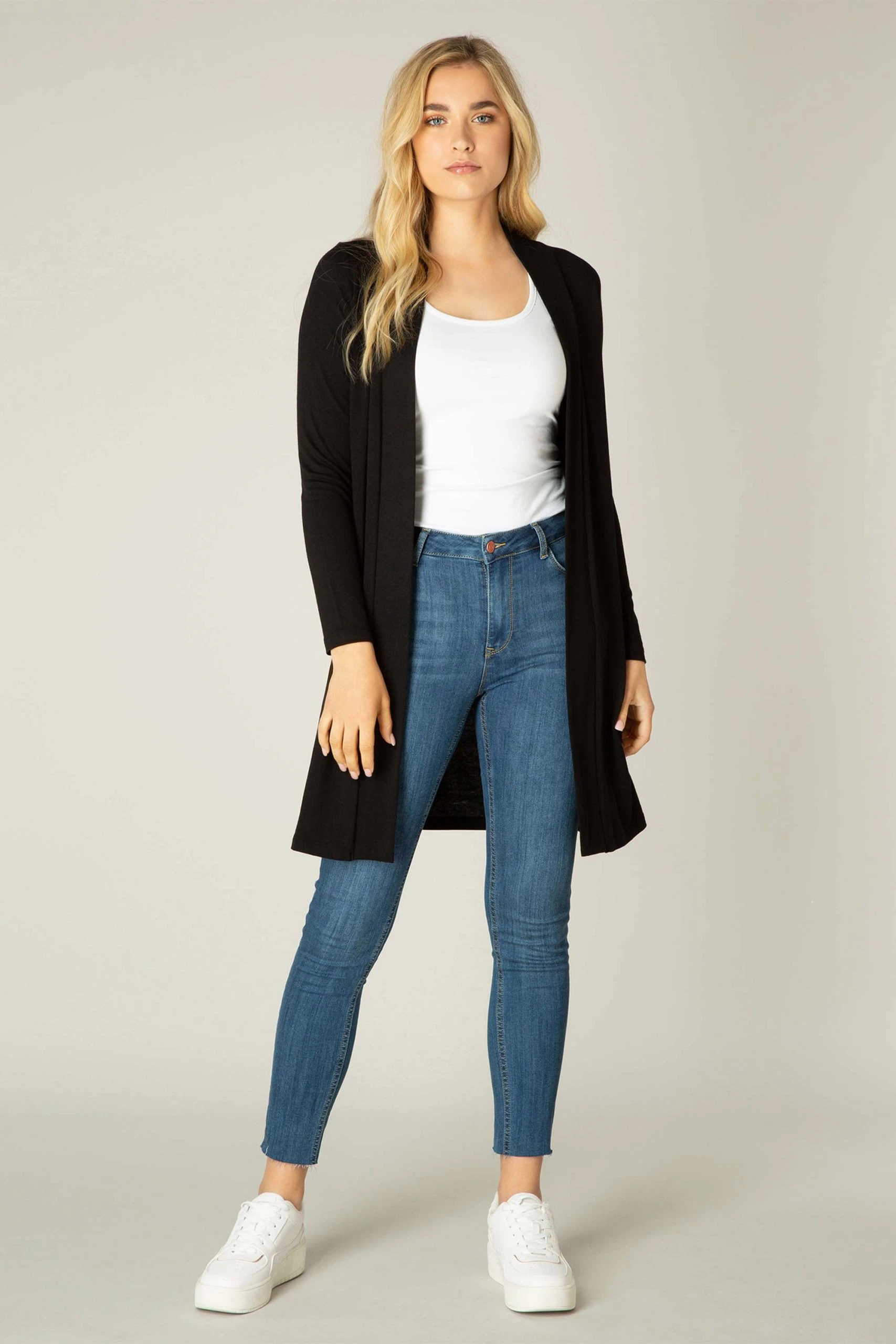 You can never go wrong with a classic cardigan. This long cardigan hits the mid thigh, has an open front with long sleeves in a stretchy and soft material making it great to throw on over top of any outfit.