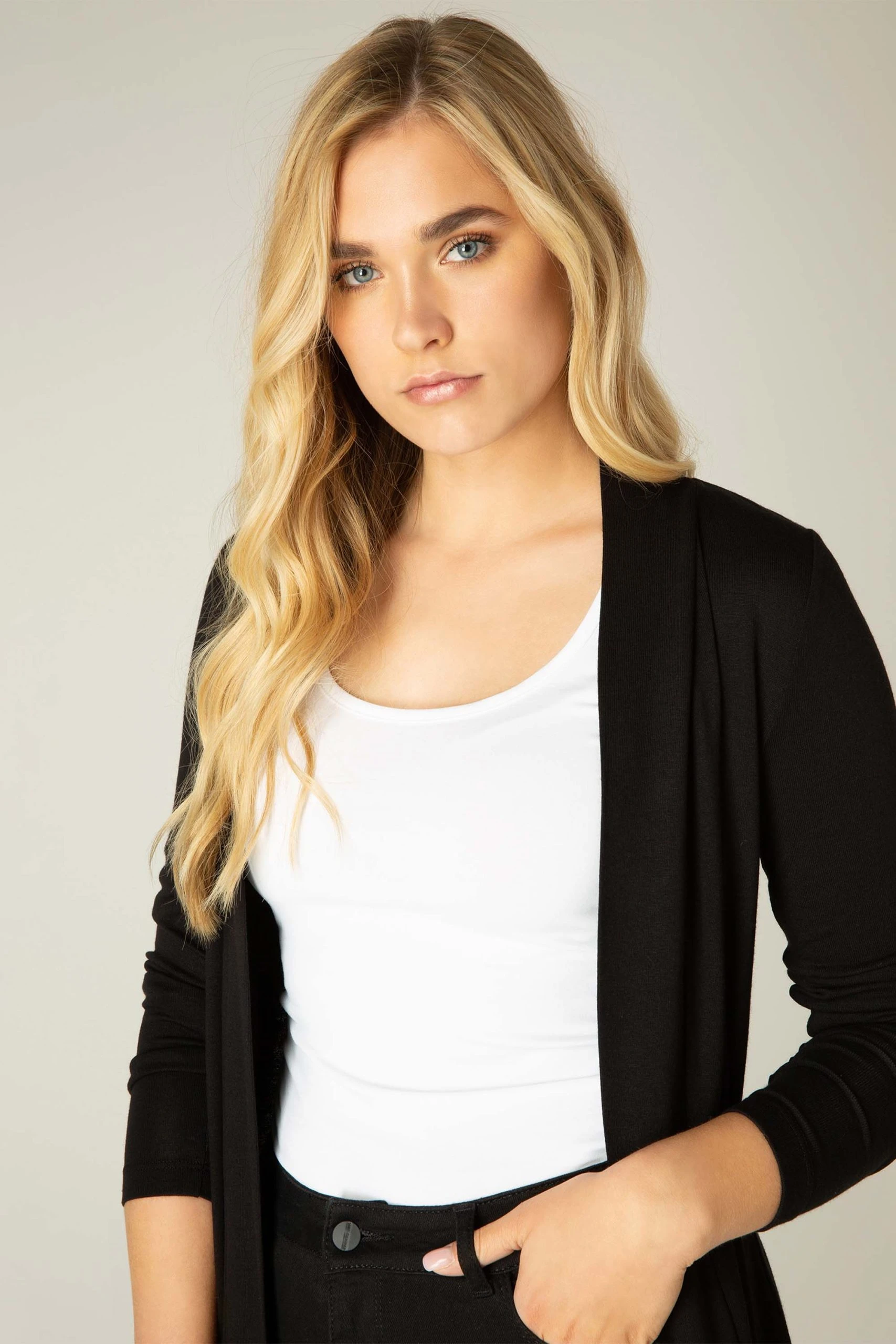You can never go wrong with a classic cardigan. This short cardigan hits below the hips, has an open front with long sleeves in a stretchy and soft material making it great to throw on over top of any outfit.