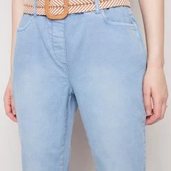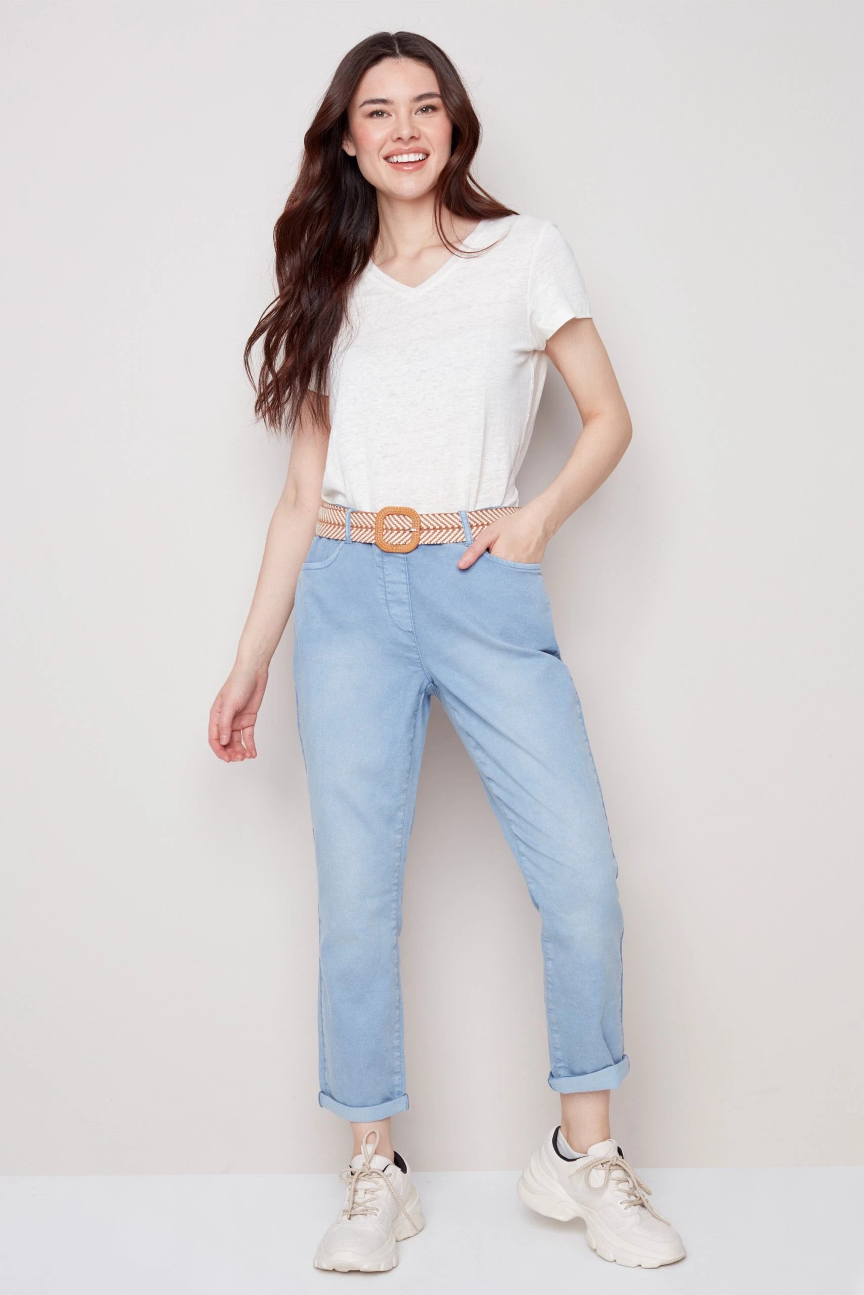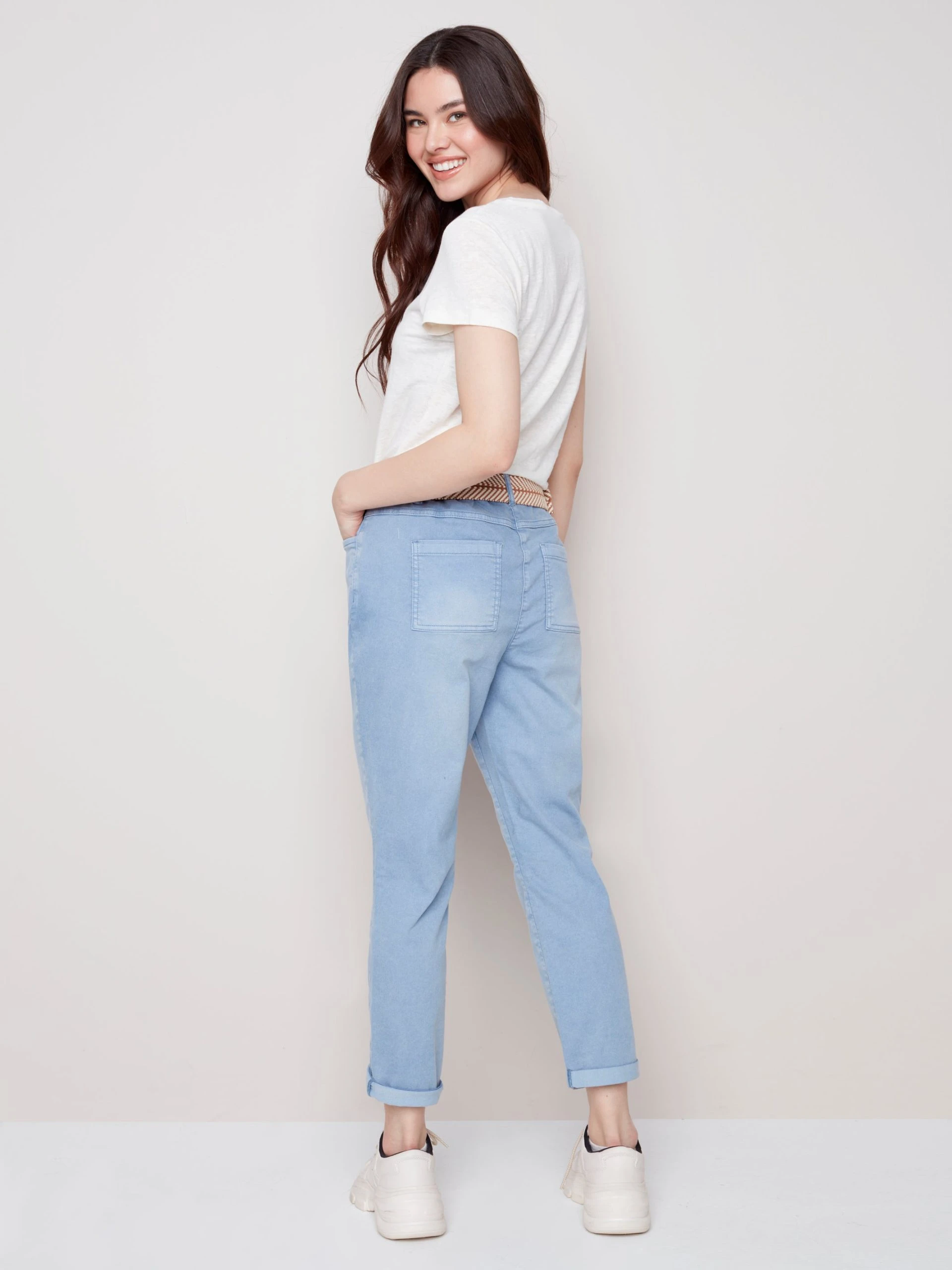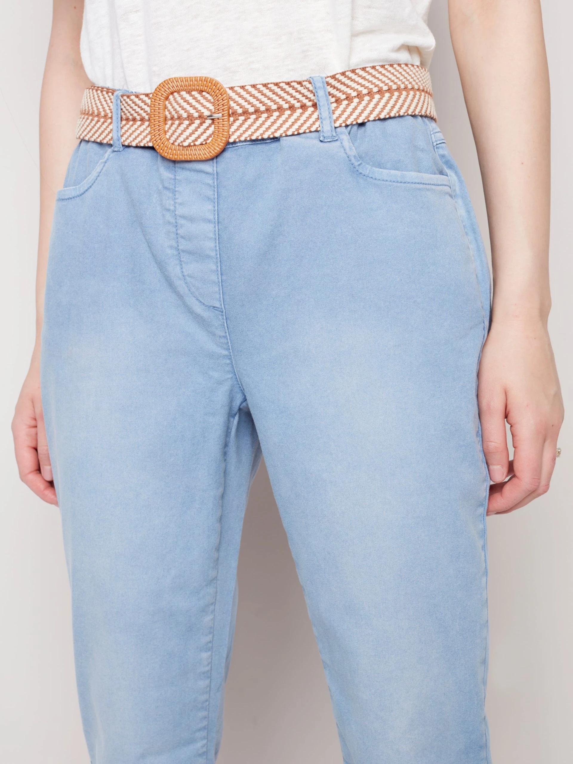 Chambray pull-on pant with elastic waist and a built in woven belt that makes a statement. It features a rolled hem with front and back pockets.