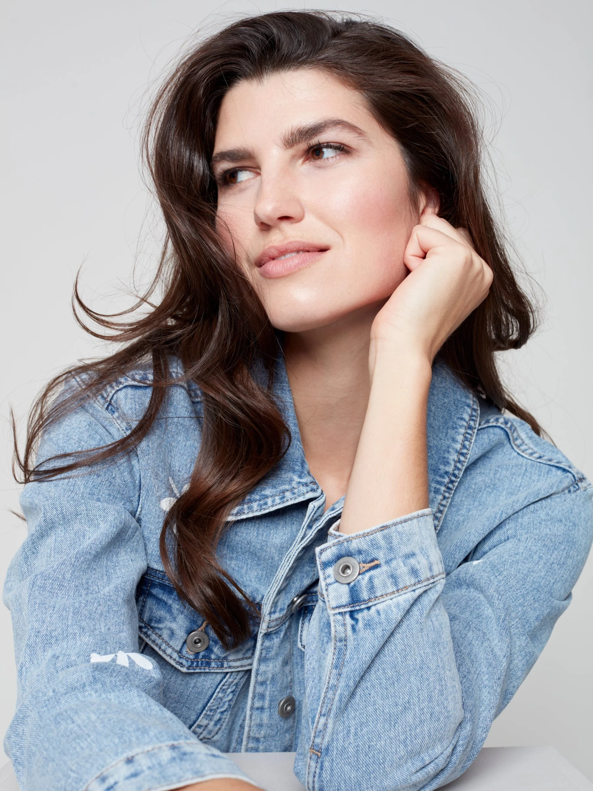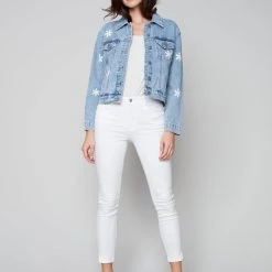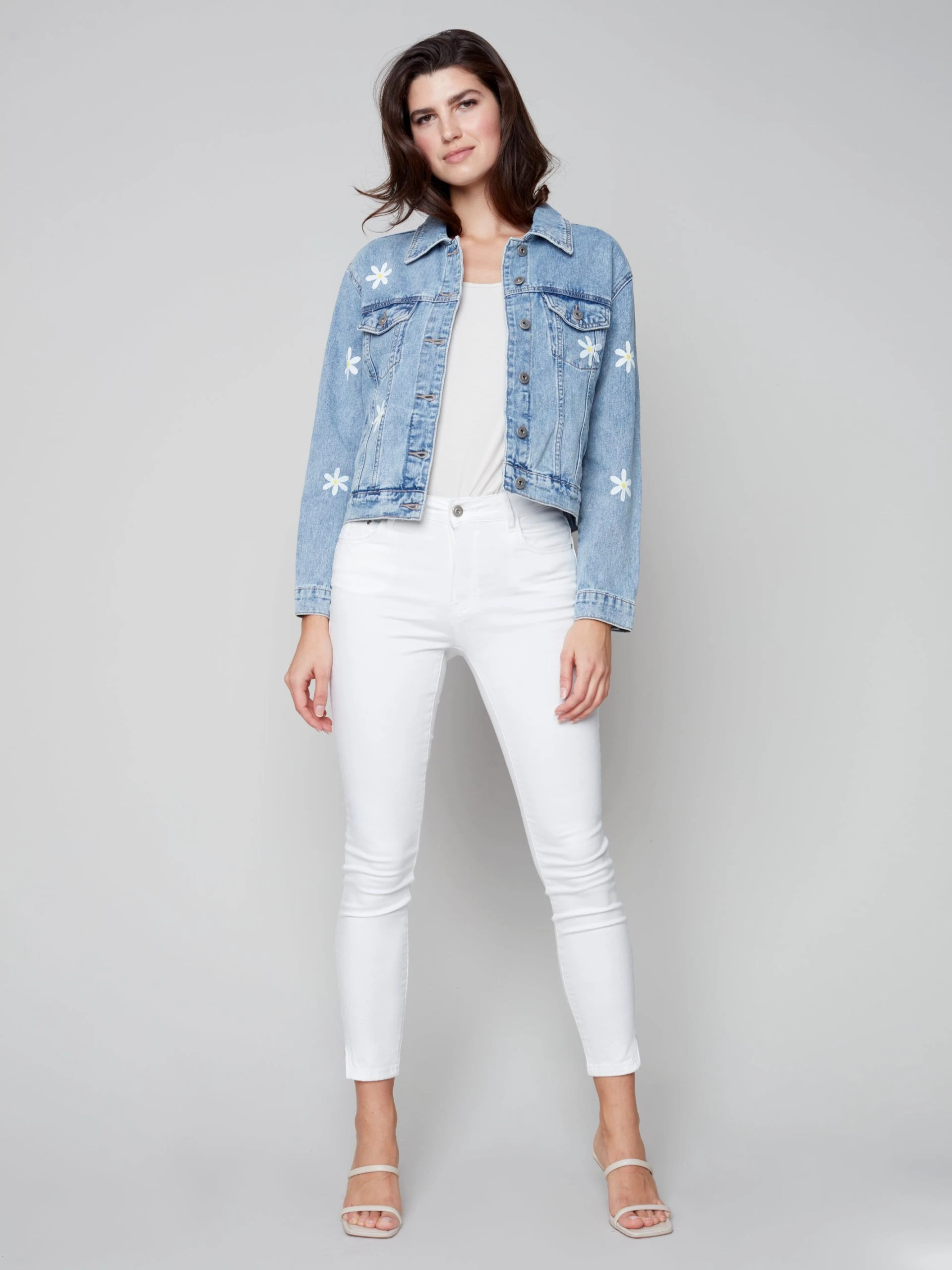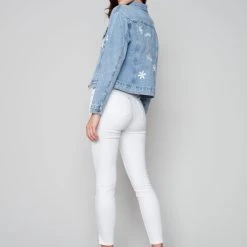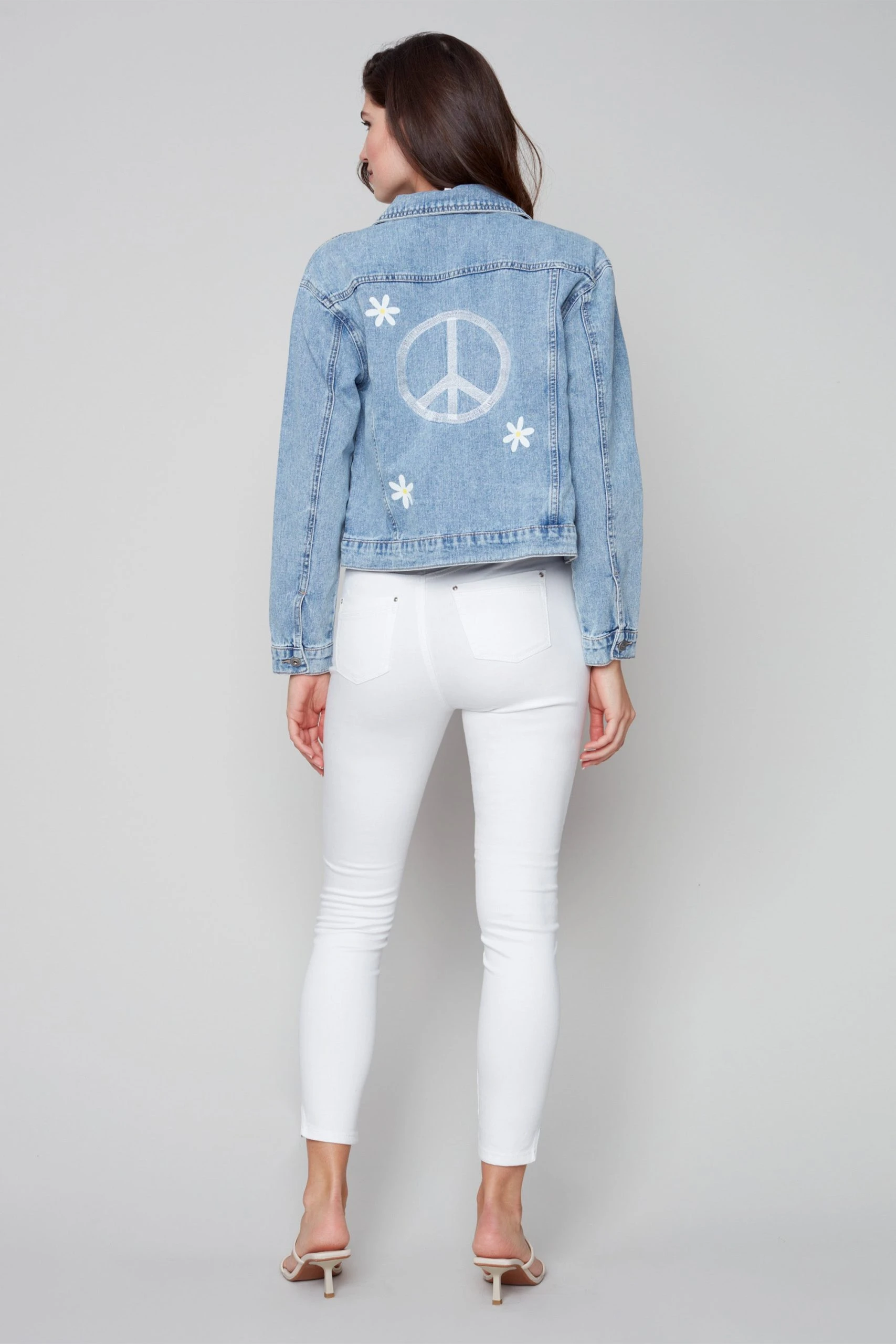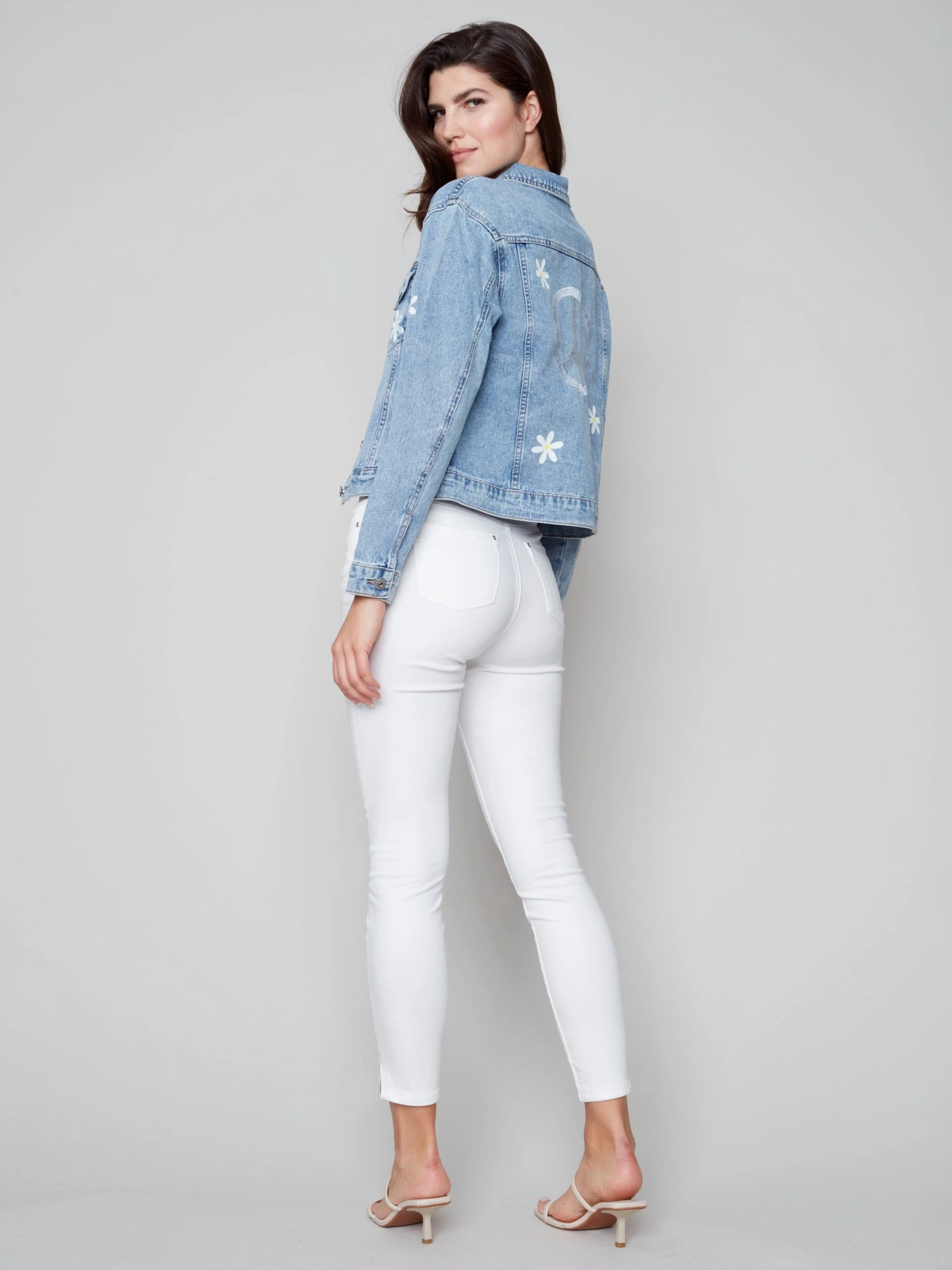 This painted denim jacket is going to make your closet bloom with possibilities this spring! The cotton fabric holds its shape while offering stretch and comfort. It features a classic collar, front buttons and a beautiful floral design along the border that adds such a cute touch to a classic jacket.
