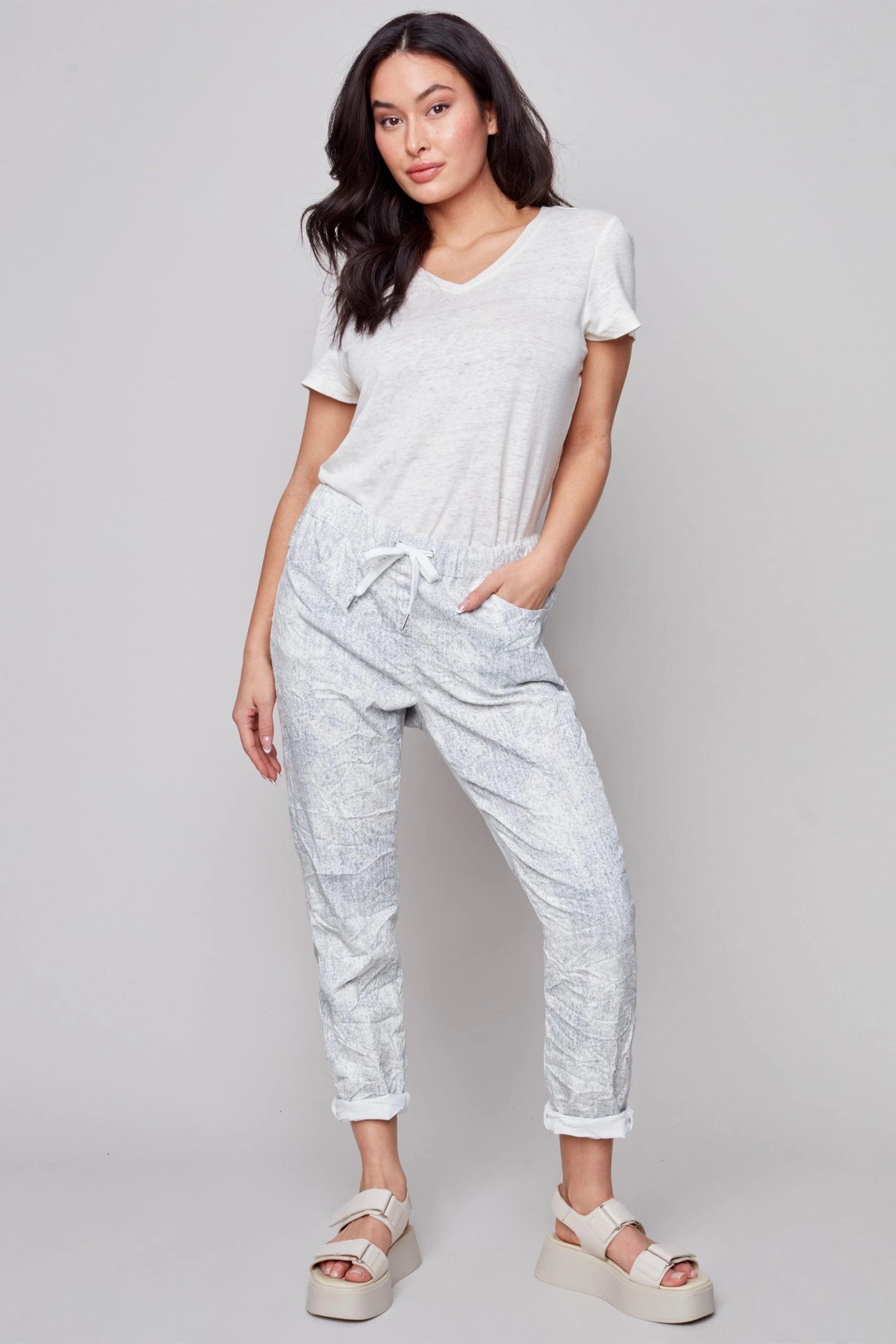 These printed crinkle bengaline pull on cropped jogger pant are super comfortable and are great for running errands on weekends, or dressing up for a weekend brunch. They feature a pull-on elastic waist with a drawstring, above ankle length with a tapered straight leg.
