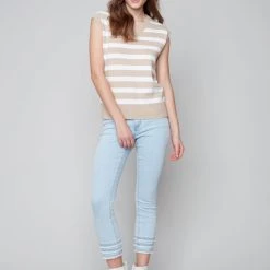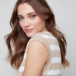 This casual style sweater vest has a relaxed fit and sleeveless construction—you can either layer it over a long-sleeve top or go bold and bare arms. It features a V-neckline and stripes across the vest.