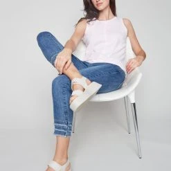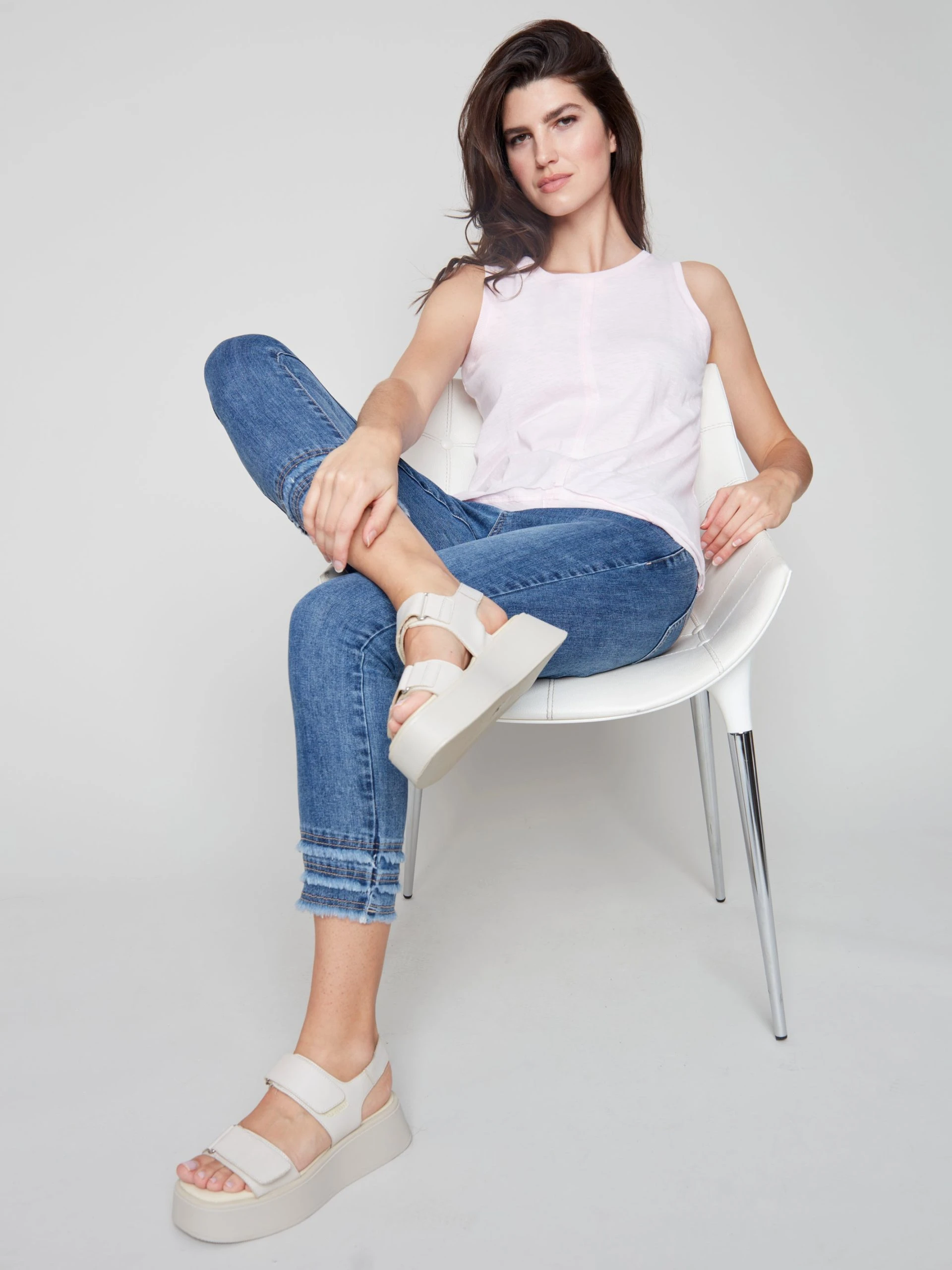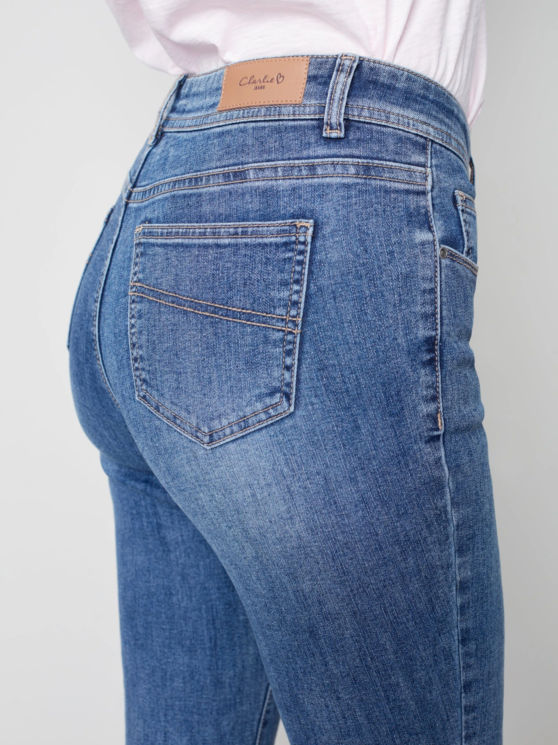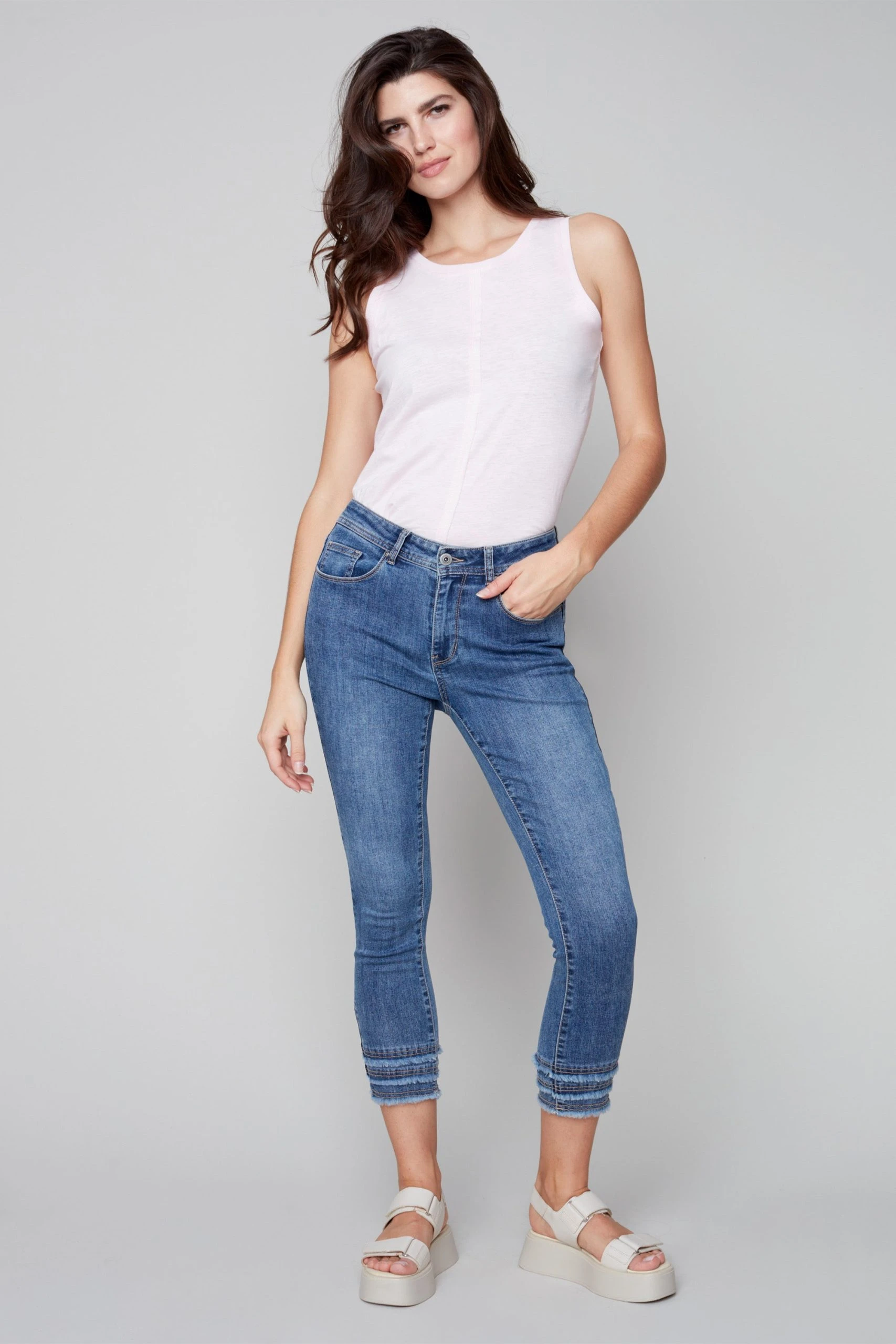 These fun jeans by Charlie B feature an eye-catching layered frayed hem, cropped length and slim fit. We love to style these slim, cropped jeans with a casual t-shirt.