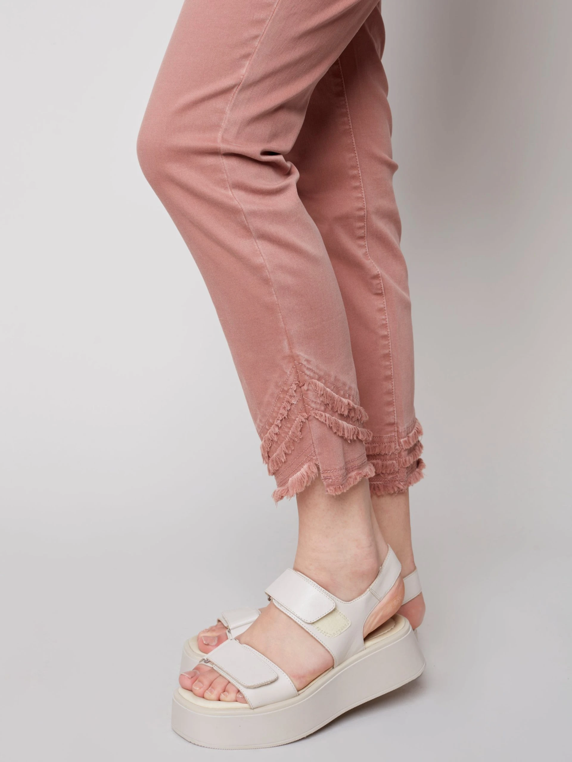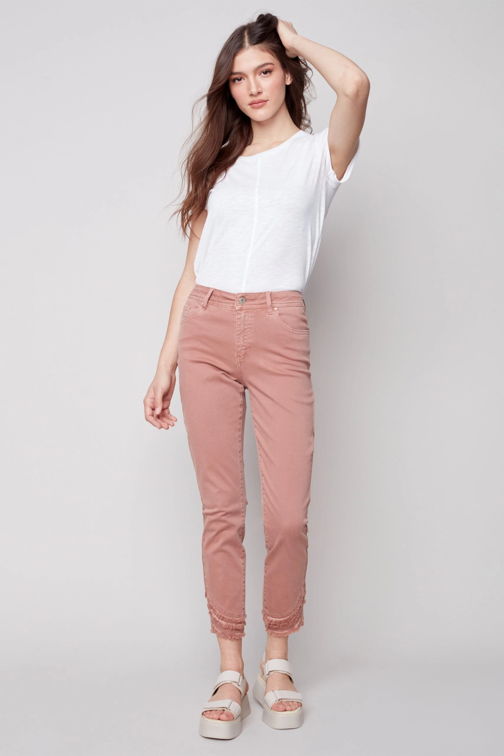These fun cropped jeans by Charlie B feature an eye-catching three layered frayed hem, cropped length, made with stretchy denim and have a slim fit.