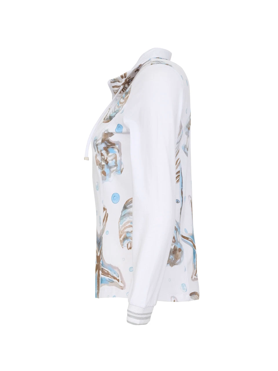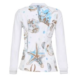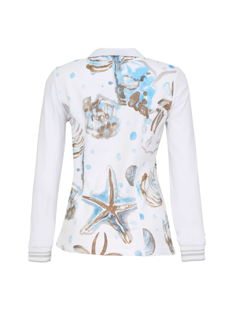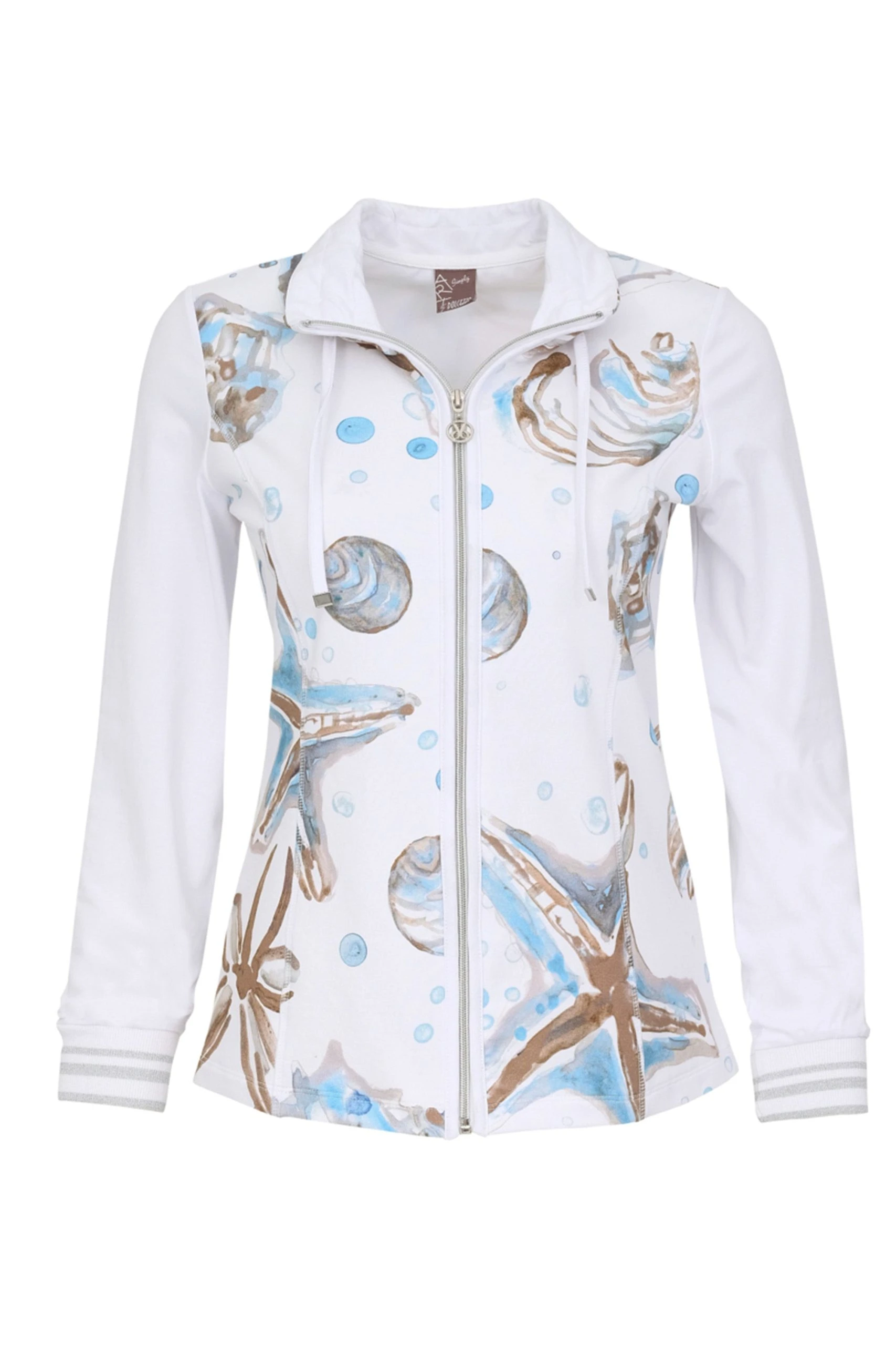 Simply Art by Dolcezza Cardigan “Cerulean Seashell IV” – gorgeous cotton-blend knit sweater featuring an artistic of June Erica Vess (from Virginia, USA) painting, in blue beige palette, front zipper, long sleeves, contrasting details, comfortable flattering fit, stretchy fabric.