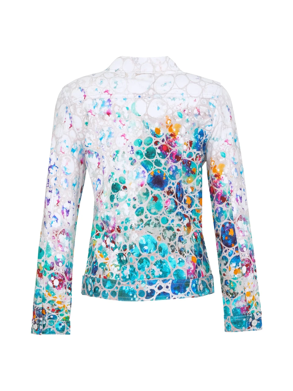 Top off your look with this unique denim style jacket. From cool nights to warmer days this art print jacket is a fresh take on a classic favourite. The stretchy and soft cotton-blend fabric harmonizes with the classic collar and neutral buttons. Keep it simple and style this statement jacket with a crisp cotton blouse and jeans.