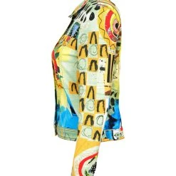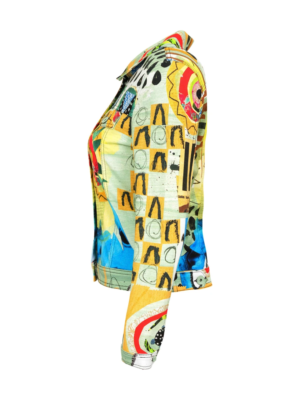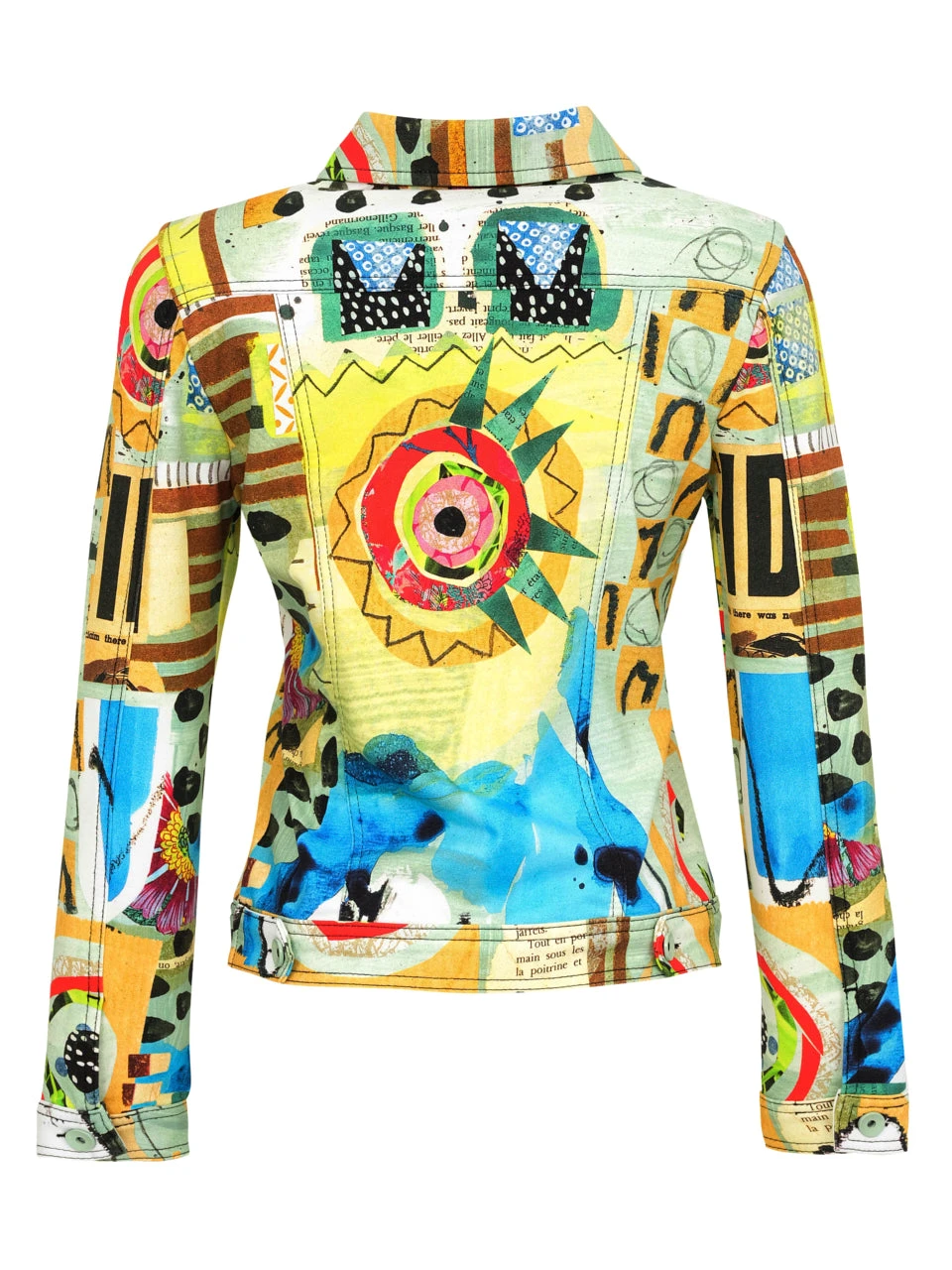 Top off your look with this unique denim style jacket. From cool nights to warmer days this art print jacket is a fresh take on a classic favourite. The stretchy and soft cotton-blend fabric harmonizes with the classic collar and neutral buttons. Keep it simple and style this statement jacket with a crisp cotton blouse and jeans.