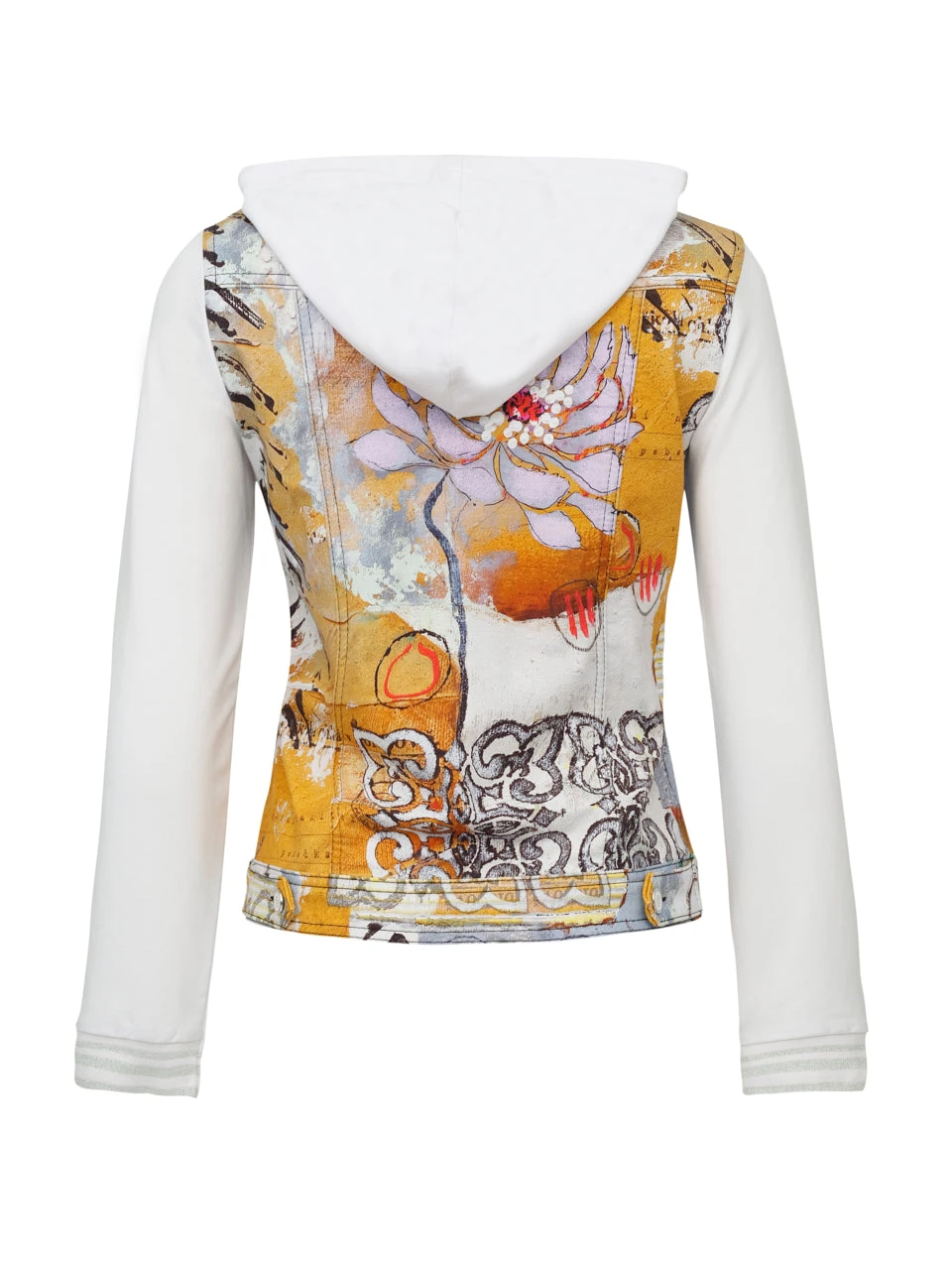 This half denim jacket and half sweater features the designs of Tamara Bakhshinyan from the Simply Art Collection by Dolcezza. It has a front zipper and front buttons, a hood with a drawstring, long sleeves, contrasting details, an easy comfortable, flattering fit and stretchy fabric.
