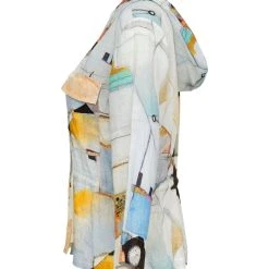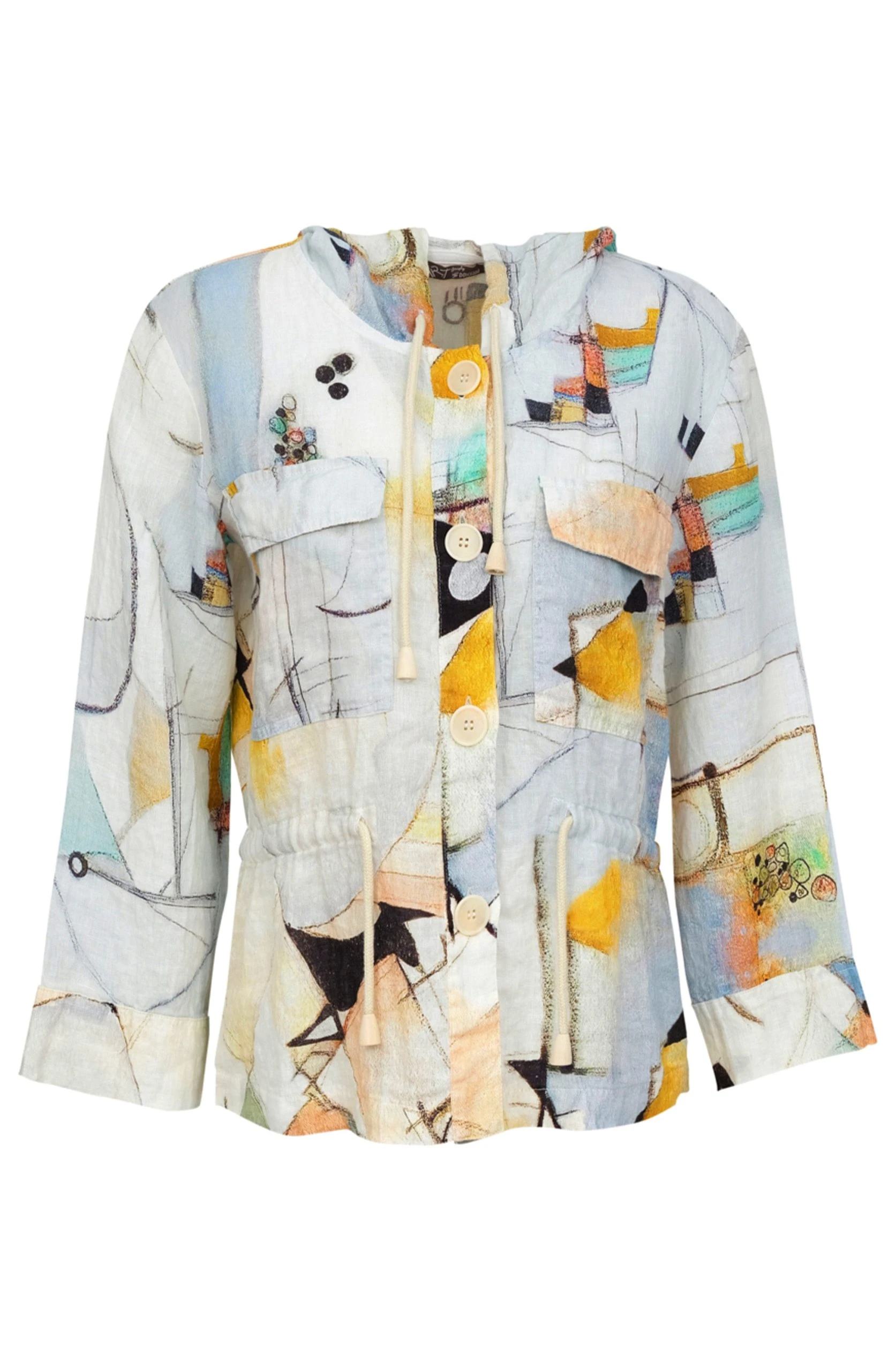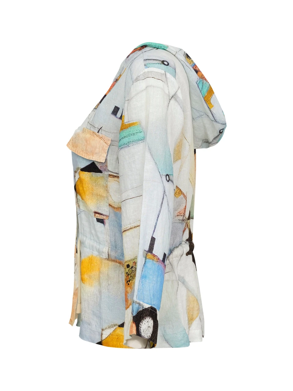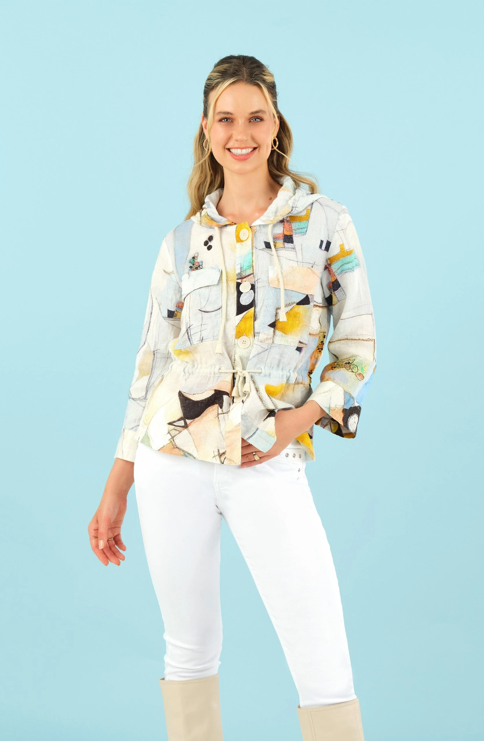 This lovely linen button up jacket has a hood with drawstrings and front pockets. The adjustable waistline cinches in and creates a flattering silhouette. Wear it open for a relaxed loook.