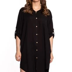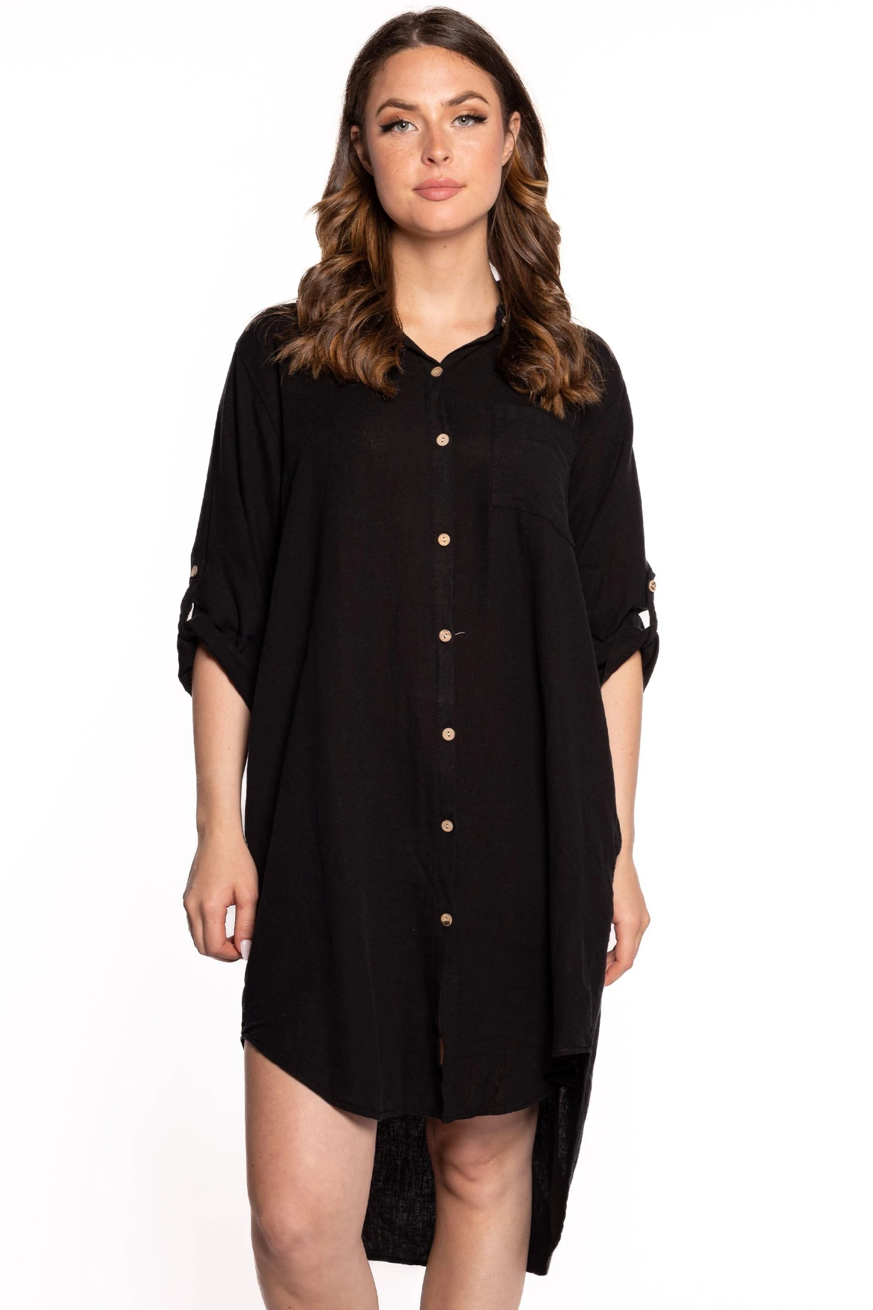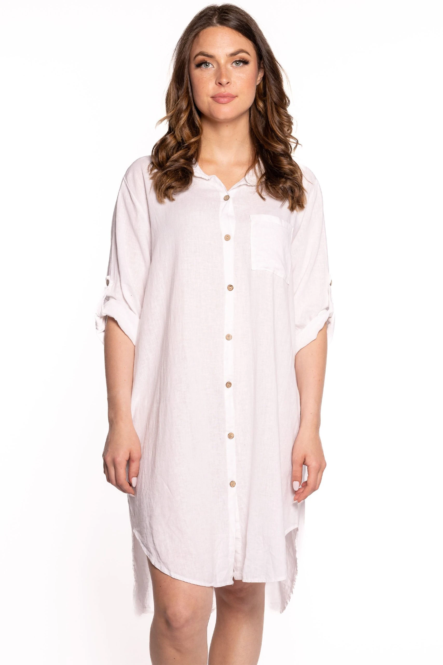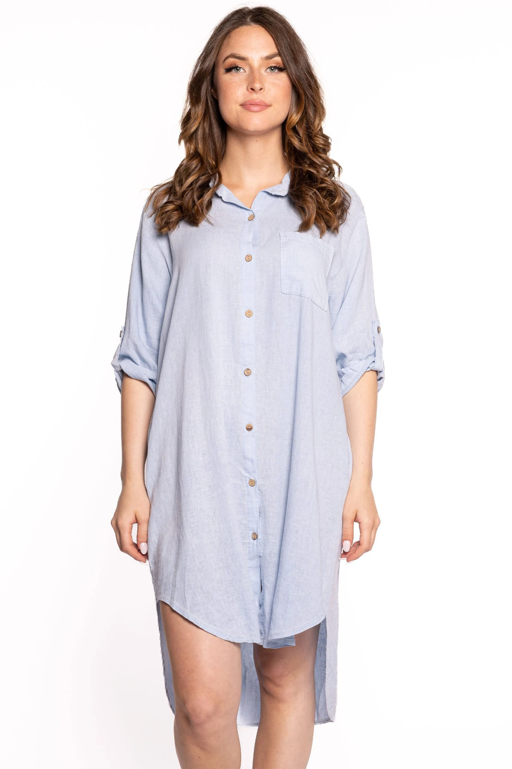 This Shirt Dress is made with lightweight linen, making it perfect for warm-weather wear. The classic collar and front buttons provide a timeless look, while the high-low hem and three-quarter sleeves with roll tabs offer versatility. Wear it open as a light jacket or close it up for a classic dress.