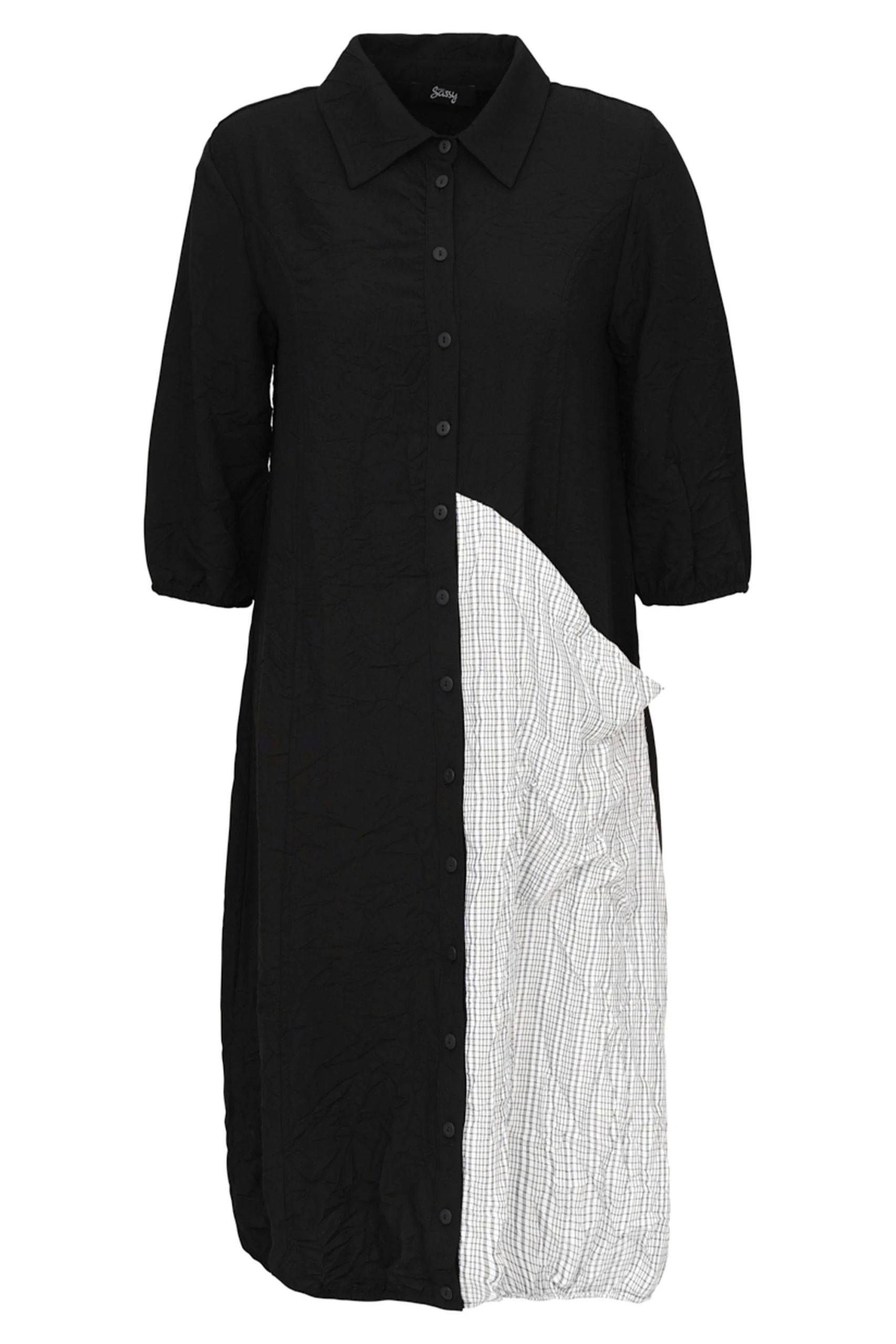The In the Dark Duster Dress is a chic and versatile wardrobe staple. Featuring front buttons, a classic collar, and three-quarter sleeves, this dress is made with a lightweight crinkle fabric for added convenience and comfort. Wear it as a dress or un buttoned as a duster jacket for a stylish yet effortless look.
