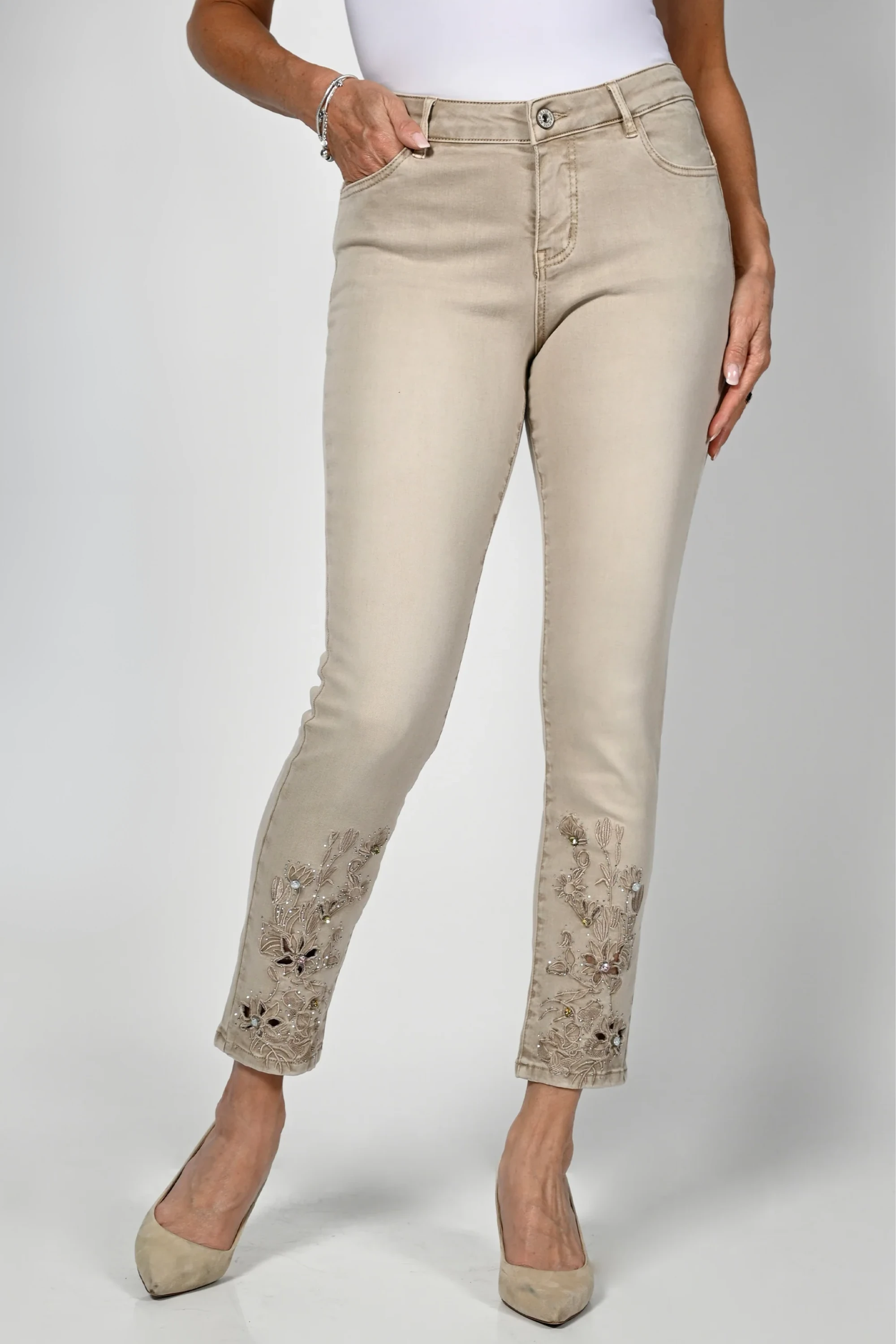 These premium high waisted 5 pocket slim leg jeans with sequin flower cut out hem detail. Featuring zip front with belt loops.