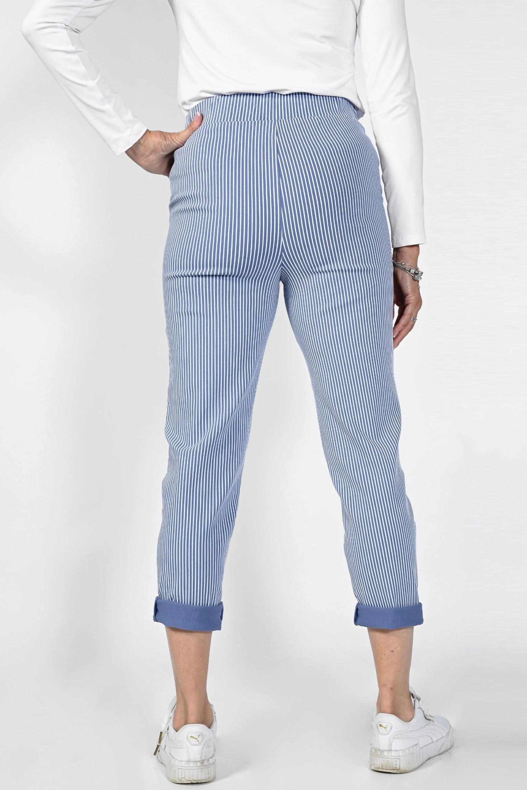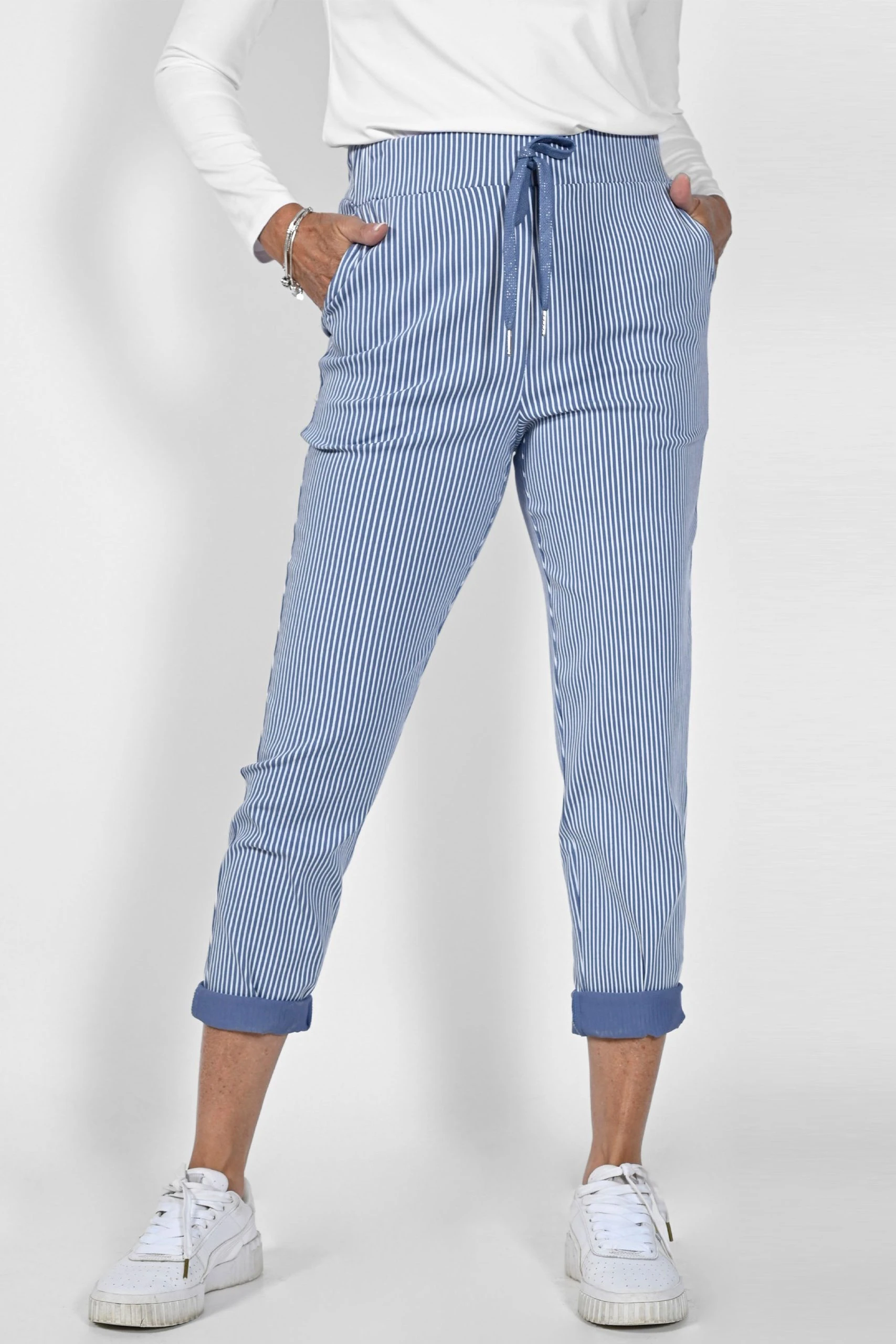 These Stripe Jogger Pants from Frank Lyman are the perfect blend of fashion and comfort. The pull-on drawstring waist provides a snug and secure fit, while the slim leg and cropped length give them a modern, stylish look. There are side pockets so you can stay comfortable and organized.
