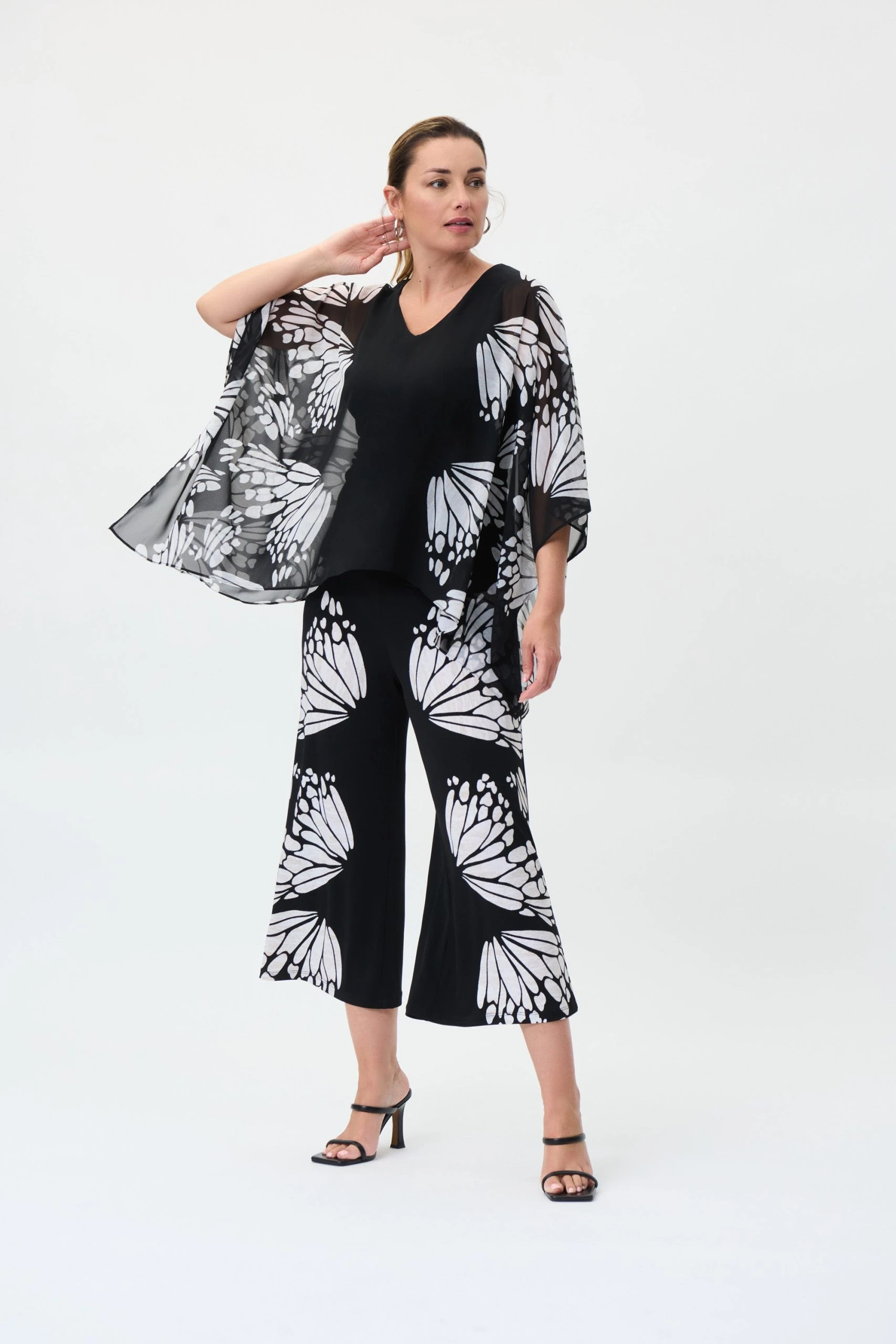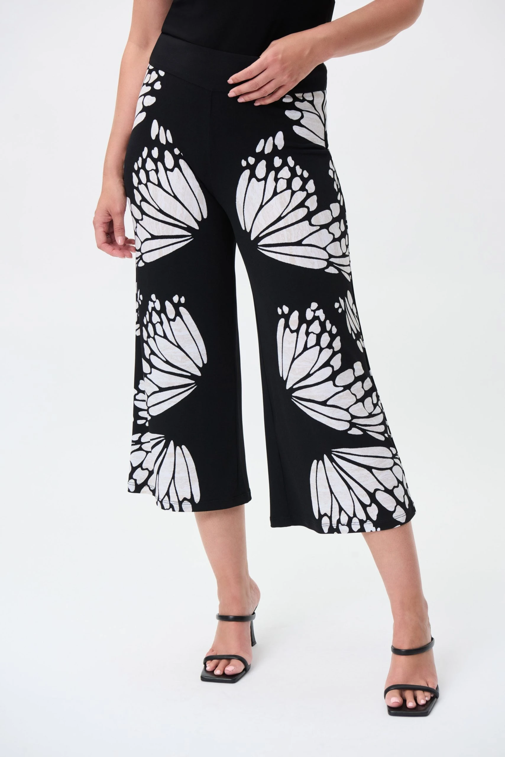 The season’s most beautifully trend, the butterfly motif, covers this wide leg Joseph Ribkoff pant for an astonishing effect. Not only does this pant have a cut that flatters, but they’re bold enough to catch the eye and become the focal point of your outfit.