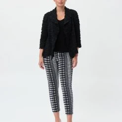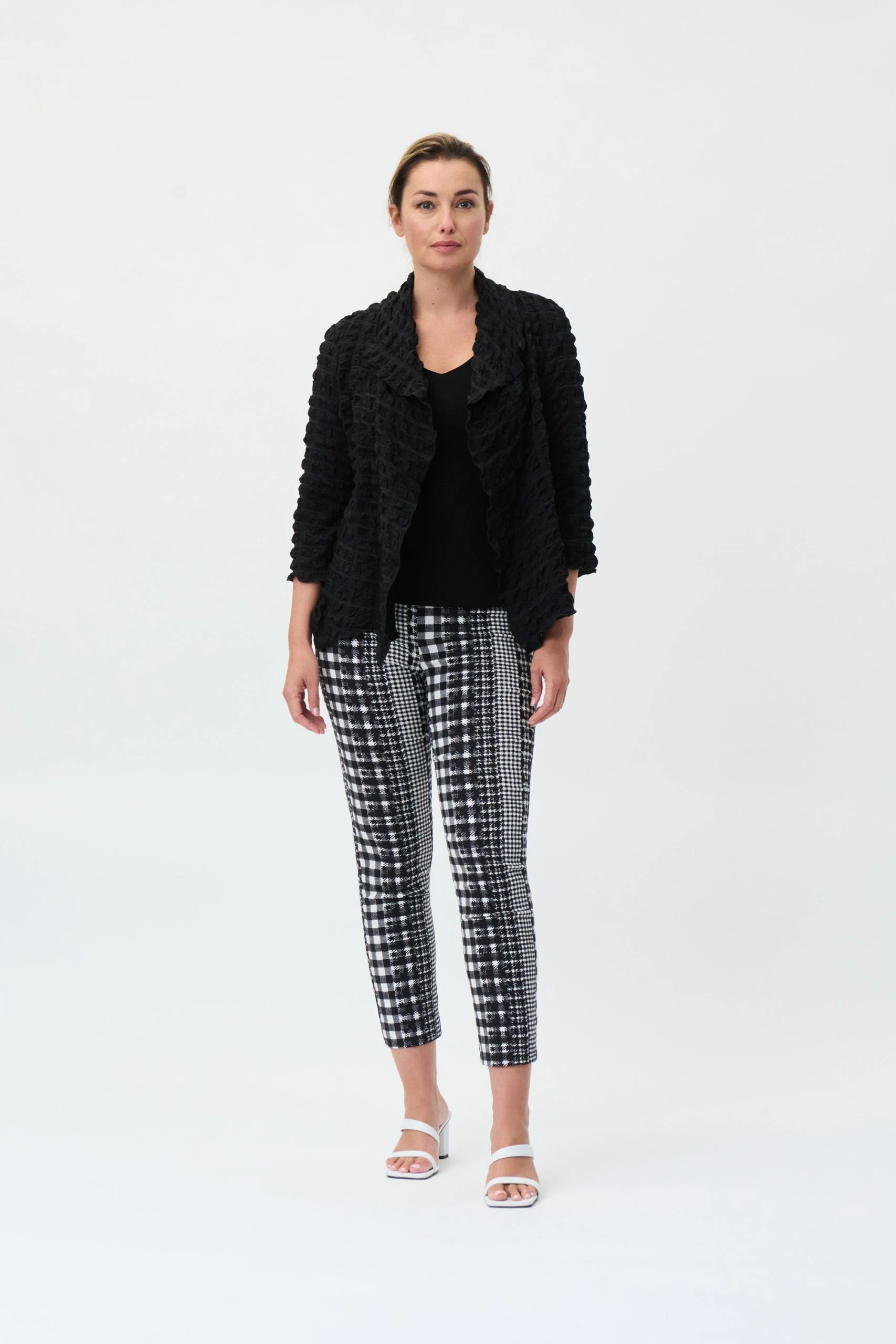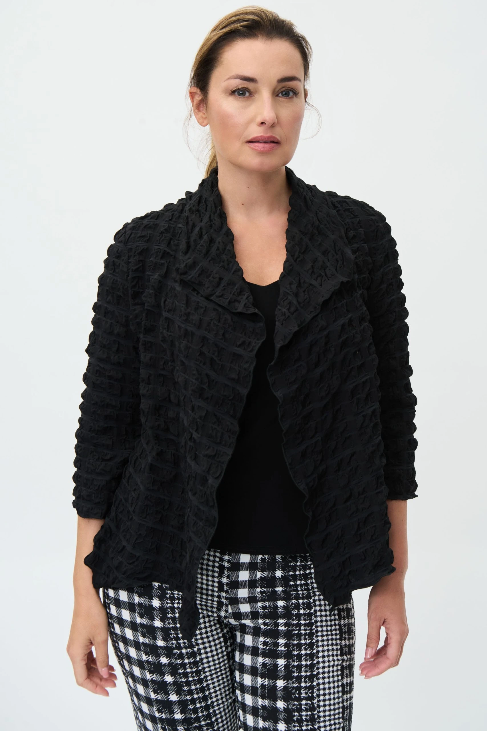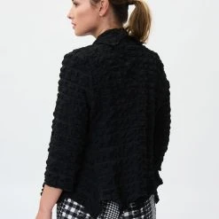 Wrap yourself in this boxy open-front cover-up. Framed by the graceful drape of a shawl collar and three-quarter length sleeves. Punctuated with side pockets. The woven crinkled fabric offers an exquisite texture that is hard to match.