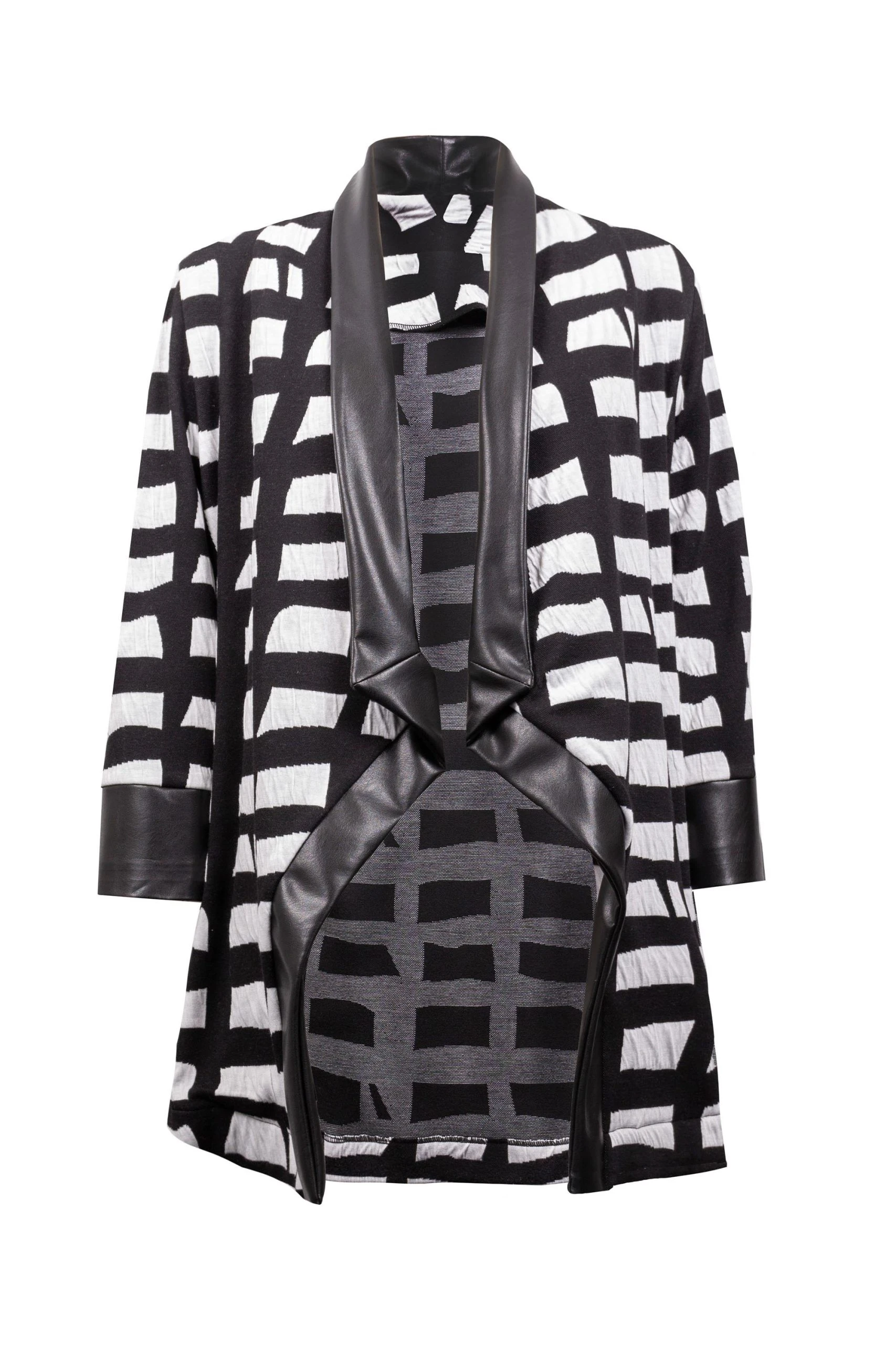 This open, flowy Joseph Ribkoff jacket is sure to make you feel stylish! It features a leather trim and cuffs with a fun black and white square design all over.