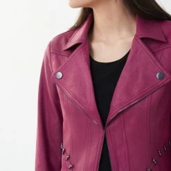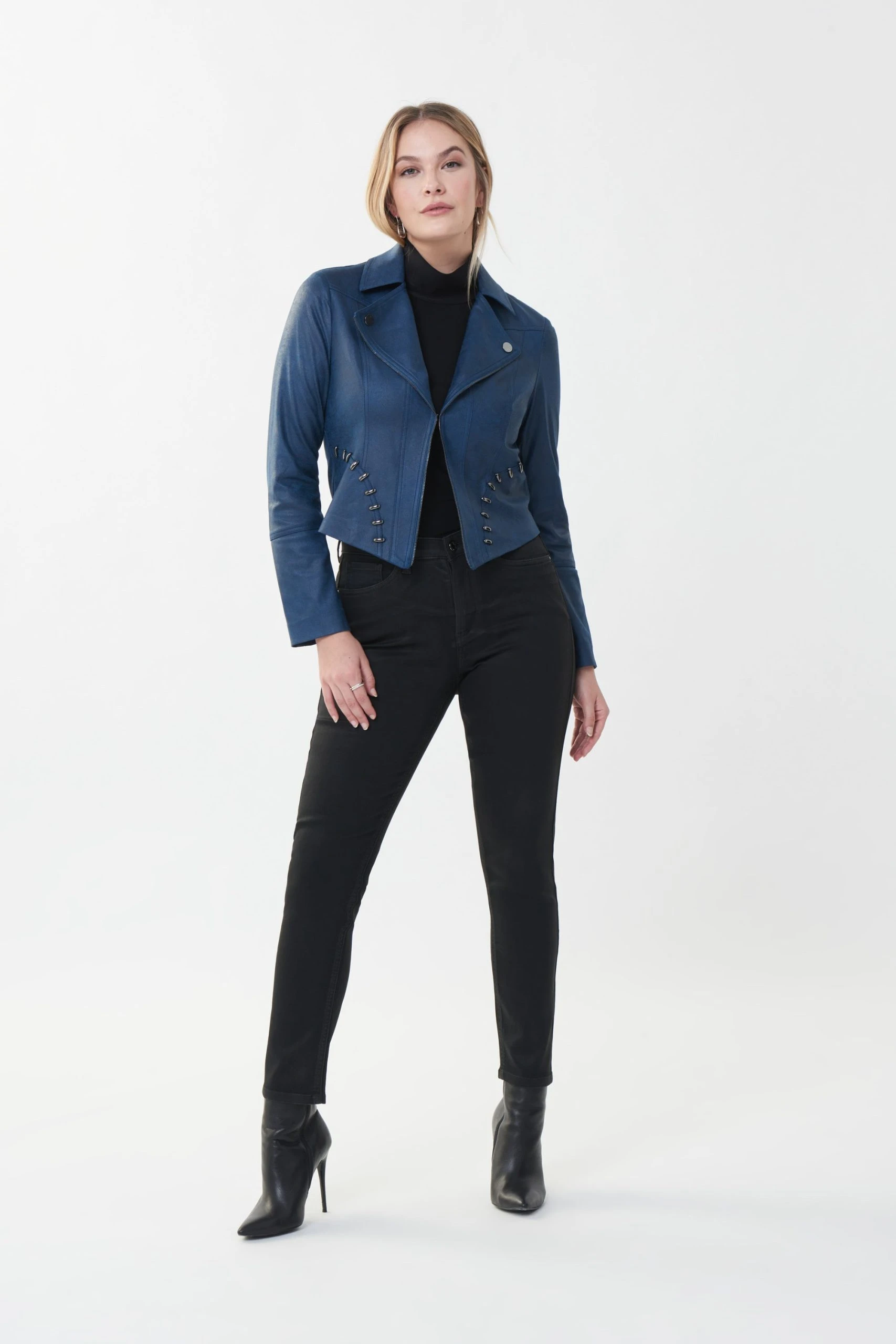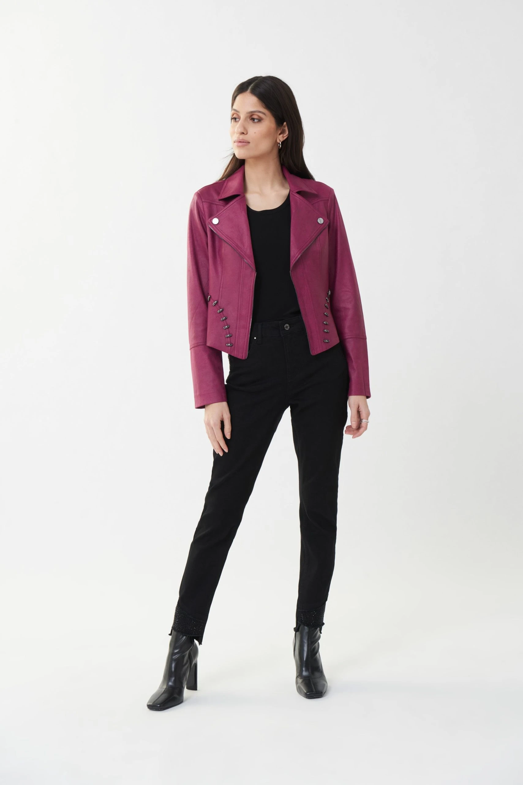 This on-trend jacket boasts a wide lapel, faux leather fabric and edgy belt detail at the hem. Our favourite way to style this jacket is with a button-up tunic shirt, leggings and ankle boots. Chic, stylish and edgy!