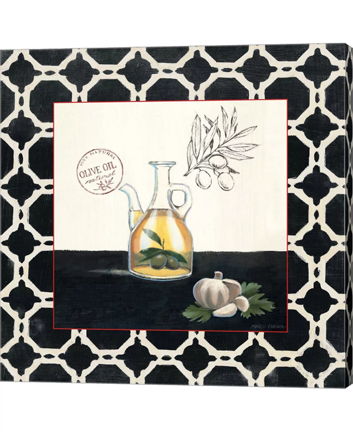 Olive Oil and Garlic by Marco Fabiano is a high quality piece of canvas artwork. The finished size of this piece is 12″ X 12″, and it has a depth 1.5″. There is a UV protective coating over the entire image, and it is ready to hang on your wall with no hardware required. Hand made in the USA. 100% Satisfaction Guaranteed.
