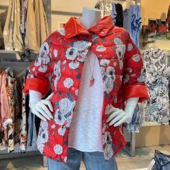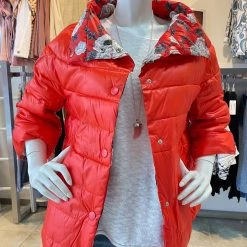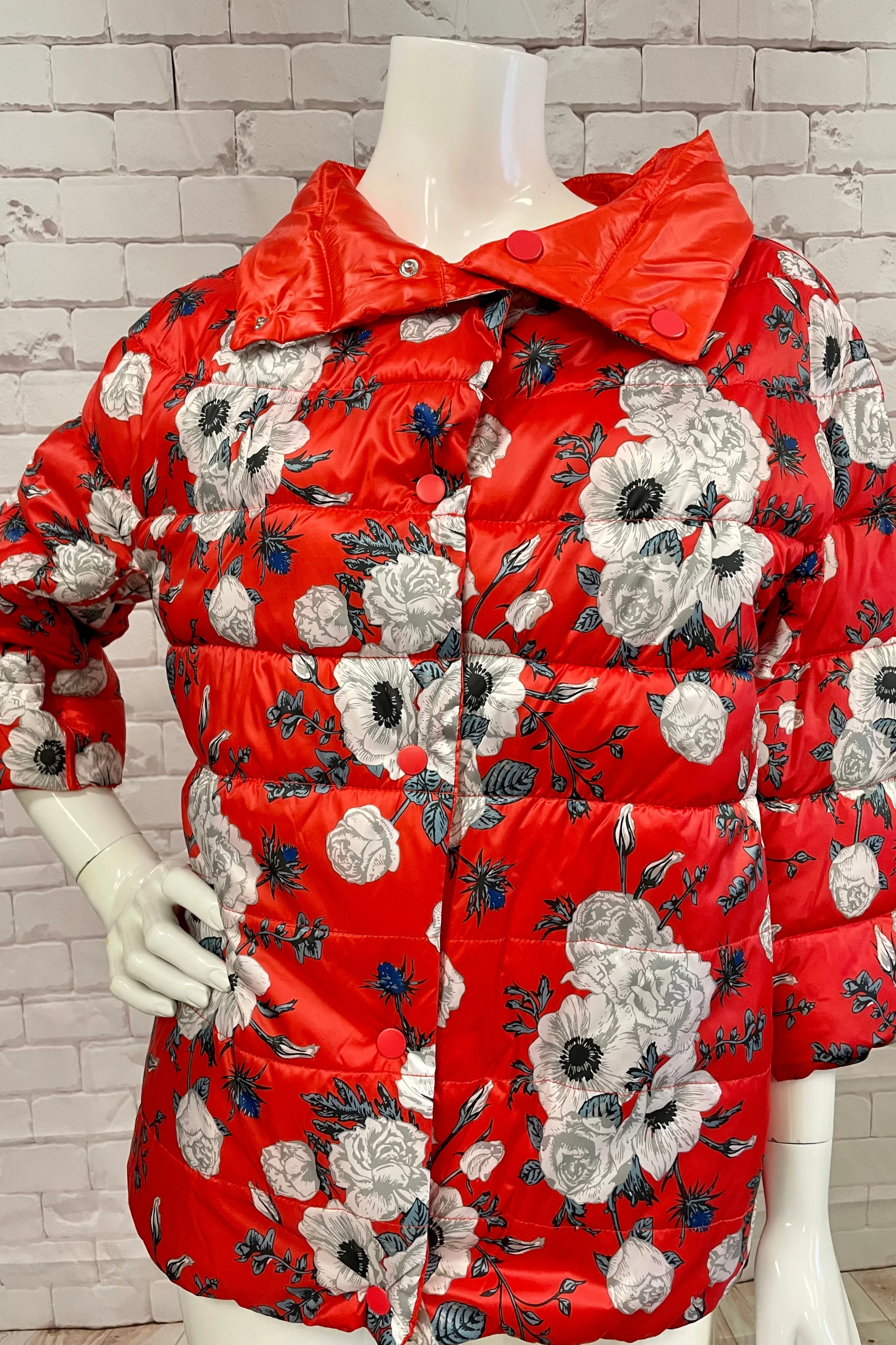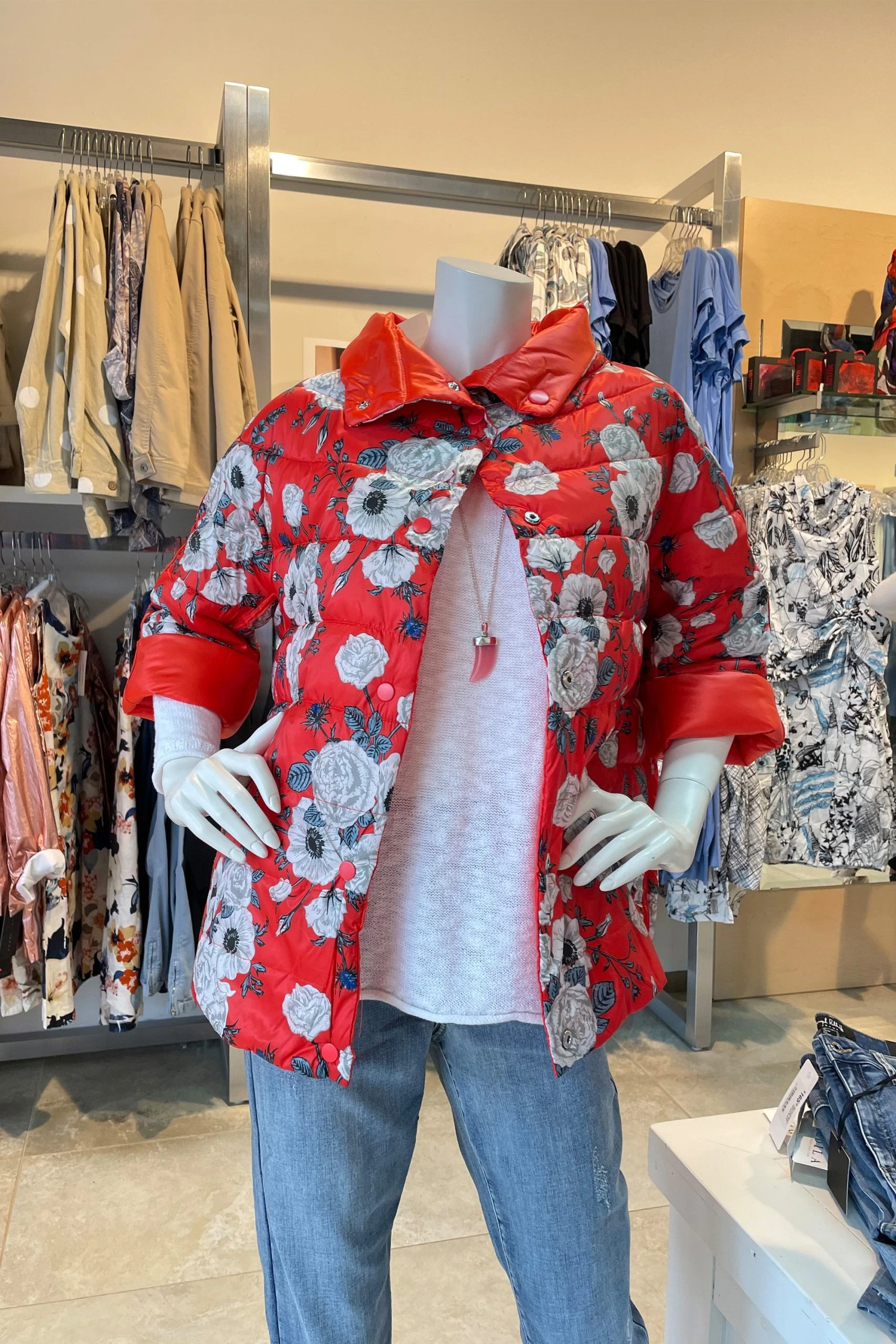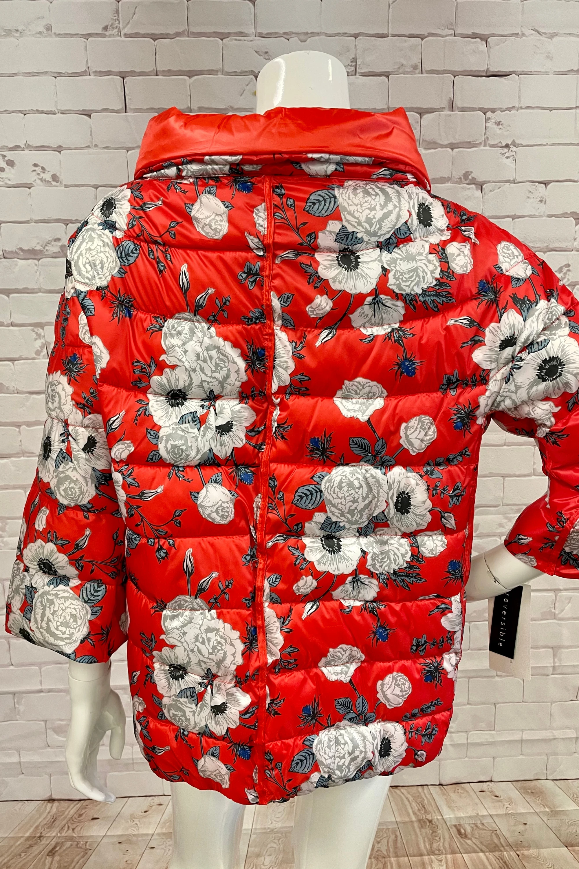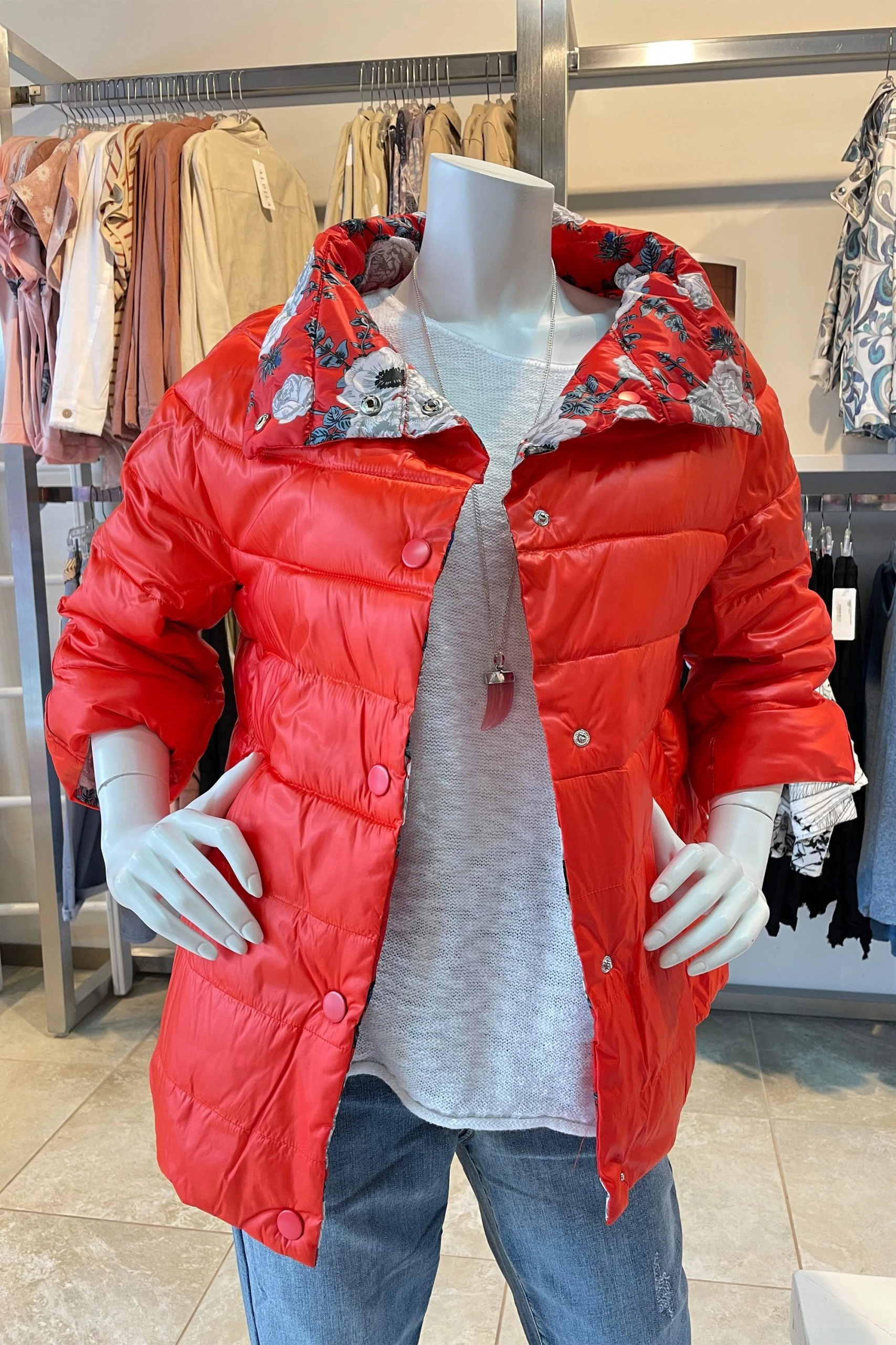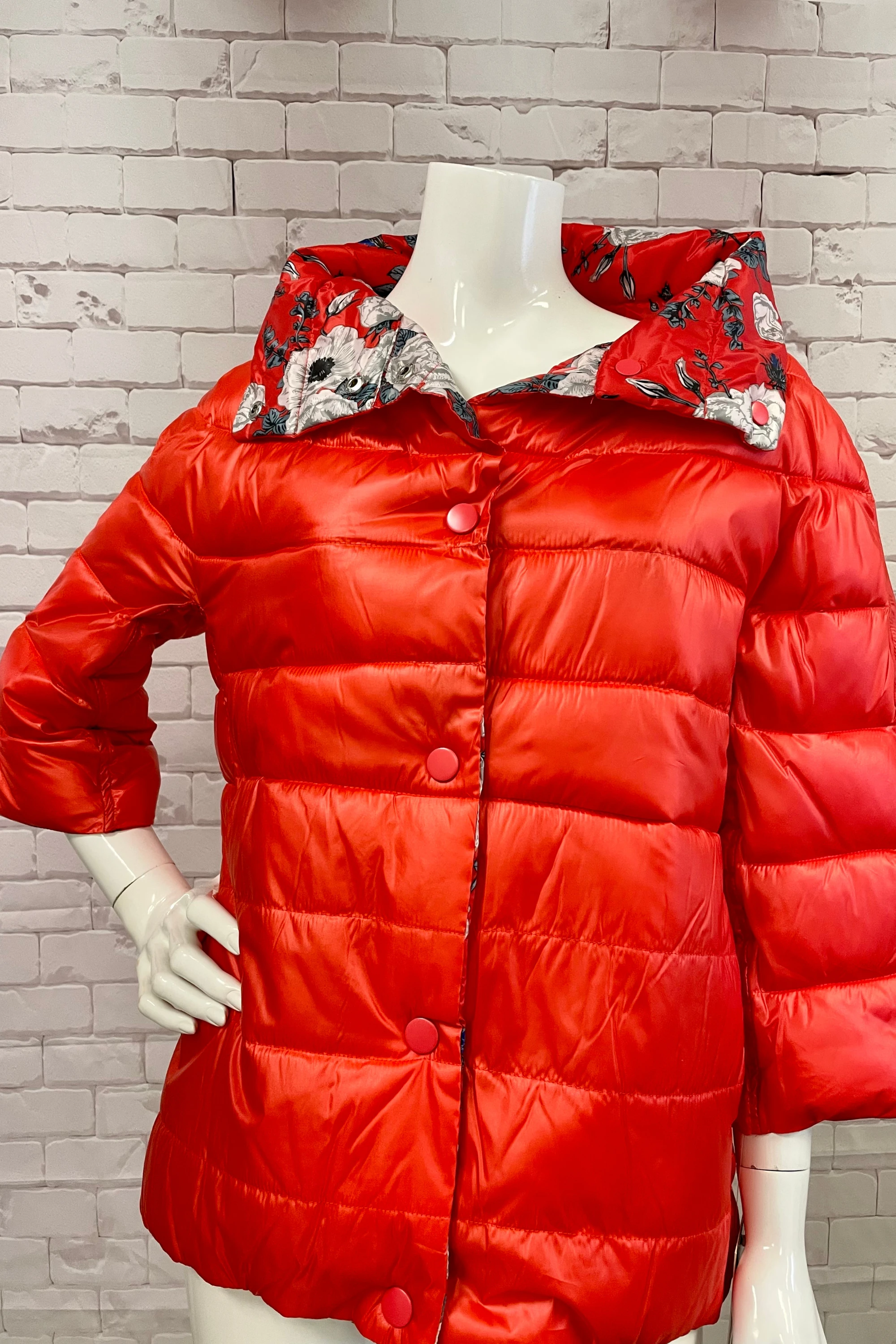This reversible puffy jacket will be sure to put a spring in your step! It has a beautiful sunrise floral pattern on one side and solid bright red on the other. It features rolled three quartrer sleeves, a snap button closure and side pockets. This jacket is basically two in one!
