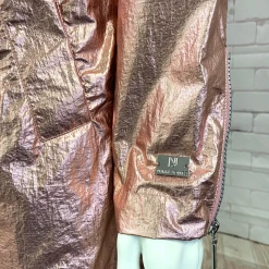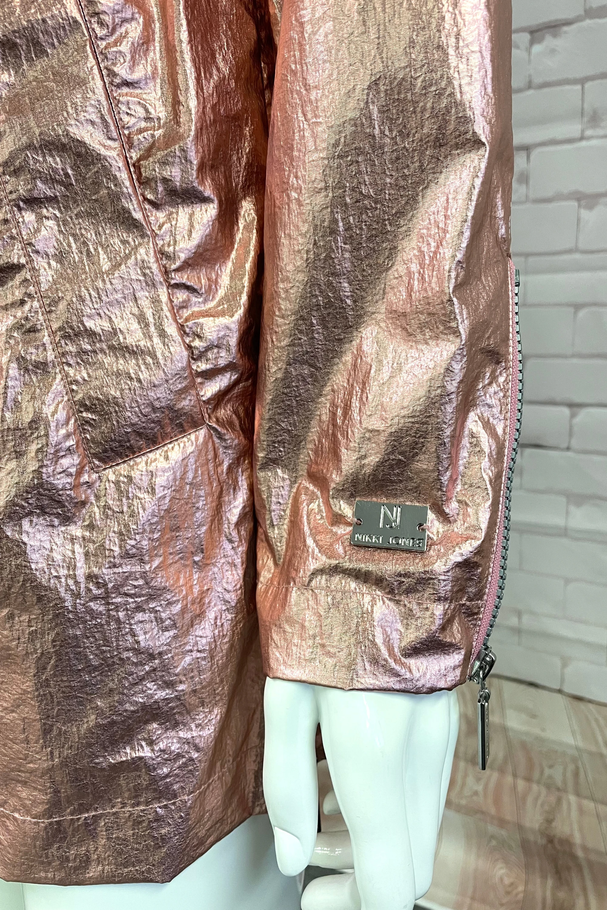 Take your rain gear to the next level with this super stylish rose gold rain jacket. It features a hood with drawstrings, a front zipper, side pockets and an elongated silhouette making it the perfect stylish rain jacket anyone could ever want.
