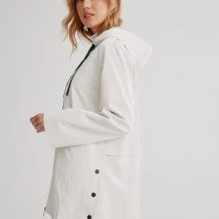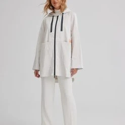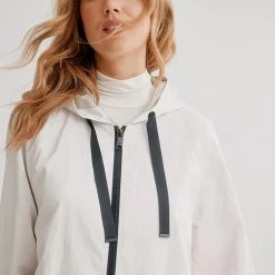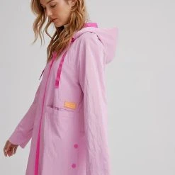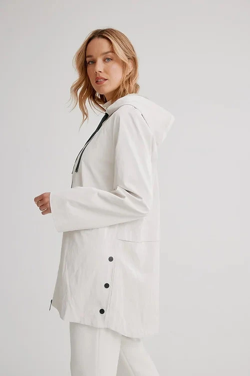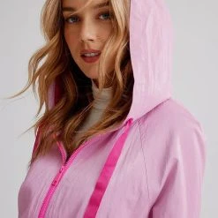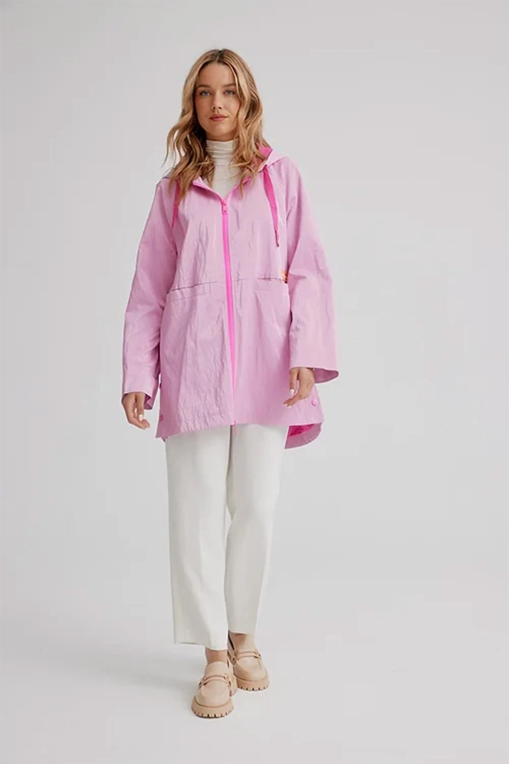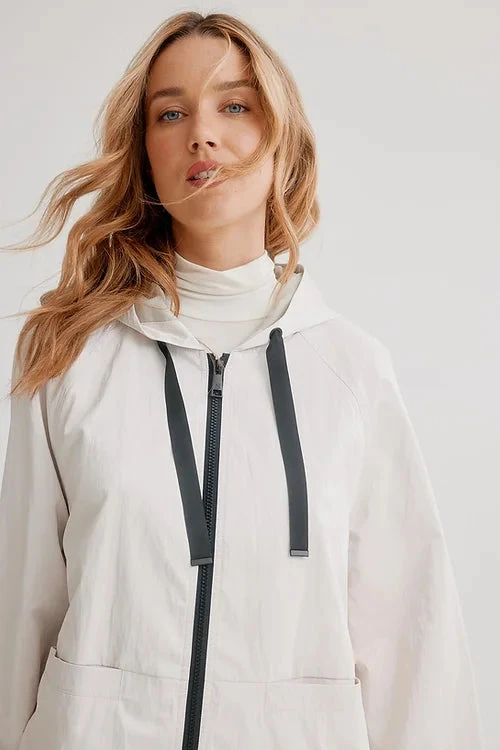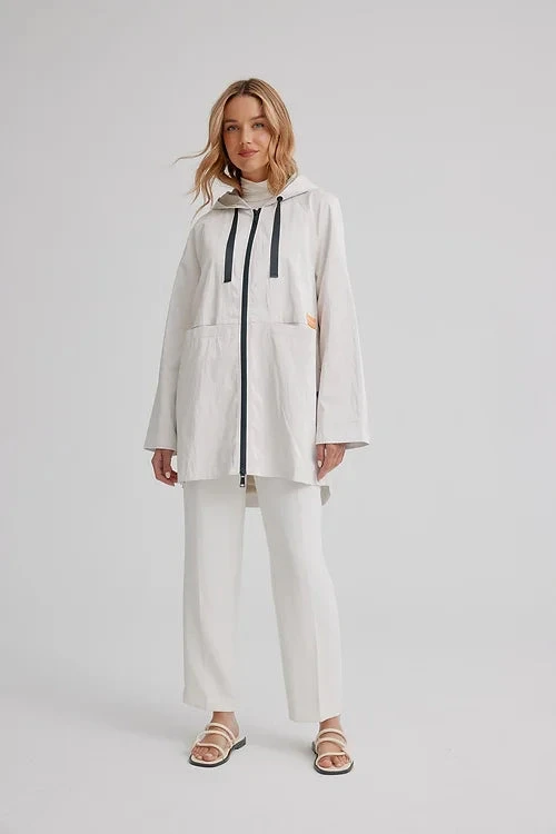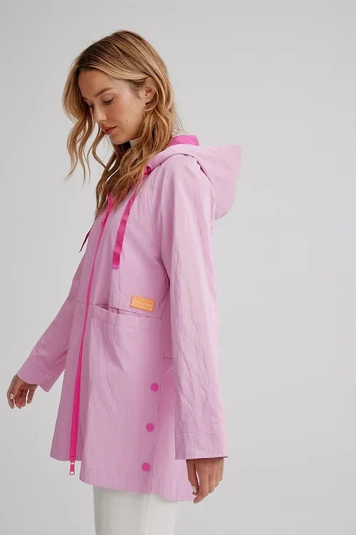 Celebrate the flourishing season with our vibrantly colourful spring styles. It has drawstrings at the hood, a front zipper, long sleeves, with front pocket inserts, a high low hem and a soft luster sheen.