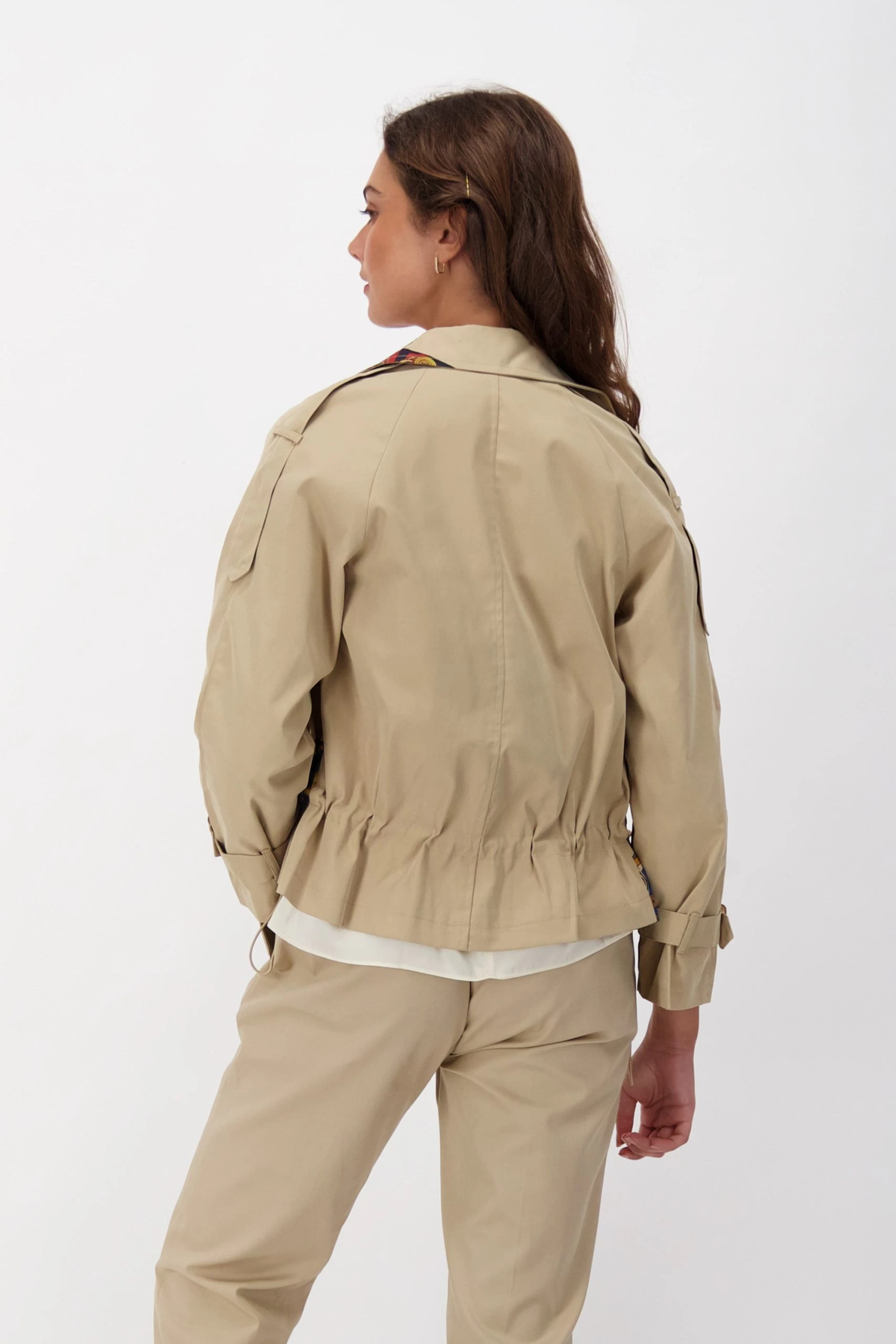 This cropped trench coat is going to be a new staple in your wardrobe. It features patchwork style print of fabulous purses, has a cinched wasit tab, front lapels and adjustable straps at the cuffs.