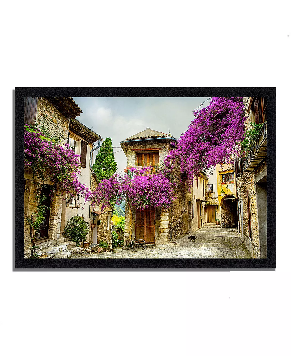 Rich pink bougainvillea vines stretch from one side of the lane to the other in this Tuscan street setting. Old stone buildings grow out of a cobblestone street. The perfect spot for a photograph. Use travel paintings and photographs in areas of repose to give your home a peaceful feeling.