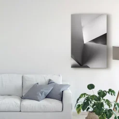 This ready to hang, gallery-wrapped art piece features a white architectural scene. Gallery-wrap is a method of wrapping an artist’s canvas around a hidden, wooden frame allowing for a frameless presentation.