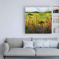 This ready to hang, gallery-wrapped art piece features flowers at the bottom of a farm landscape. Gallery-wrap is a method of wrapping an artist’s canvas around a hidden, wooden frame allowing for a frameless presentation.