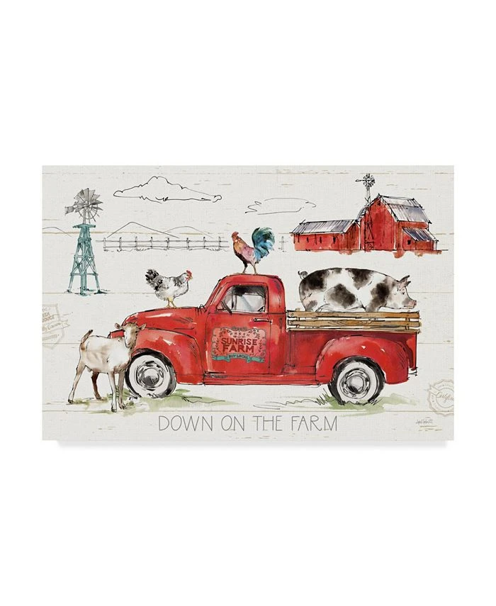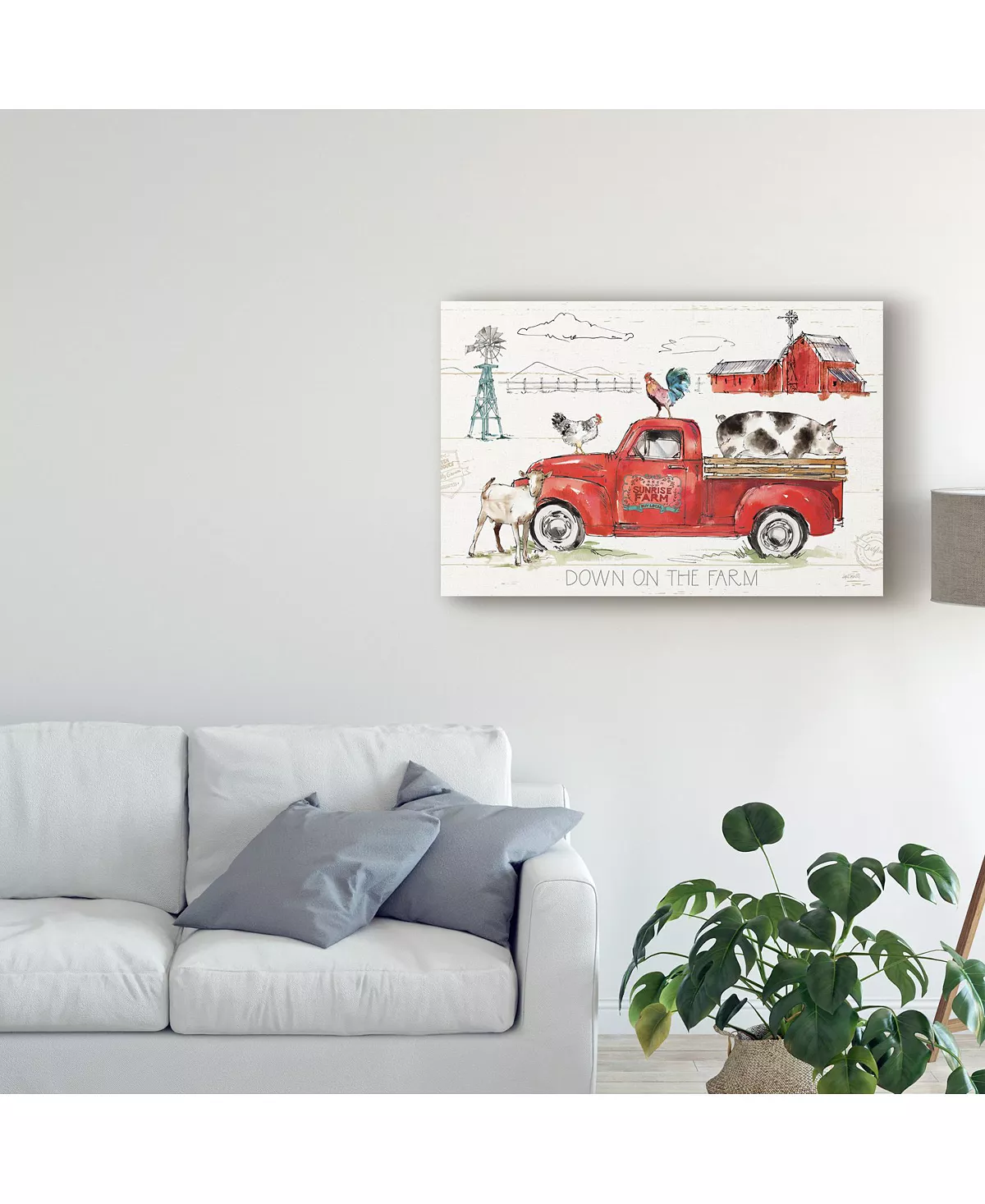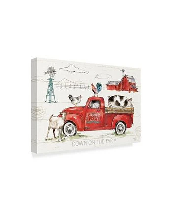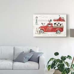 This ready to hang, gallery-wrapped art piece features animals in and around a vintage red truck in front of a farm. Gallery-wrap is a method of wrapping an artist’s canvas around a hidden, wooden frame allowing for a frameless presentation.