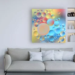 This ready to hang, gallery-wrapped art piece features a modern abstract photograph of circled patterns and light in pastel shades. Gallery-wrap is a method of wrapping an artist’s canvas around a hidden, wooden frame allowing for a frameless presentation.