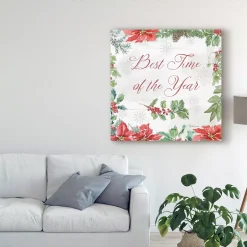 This ready to hang, gallery-wrapped art piece features the words “Best Time of the Year” in red script surrounded by a frame of poinsettias. This art is gallery-wrapped, which allows for a frameless presentation.