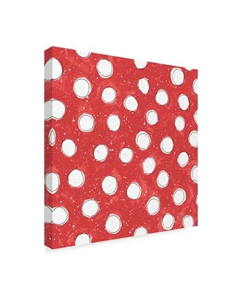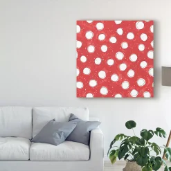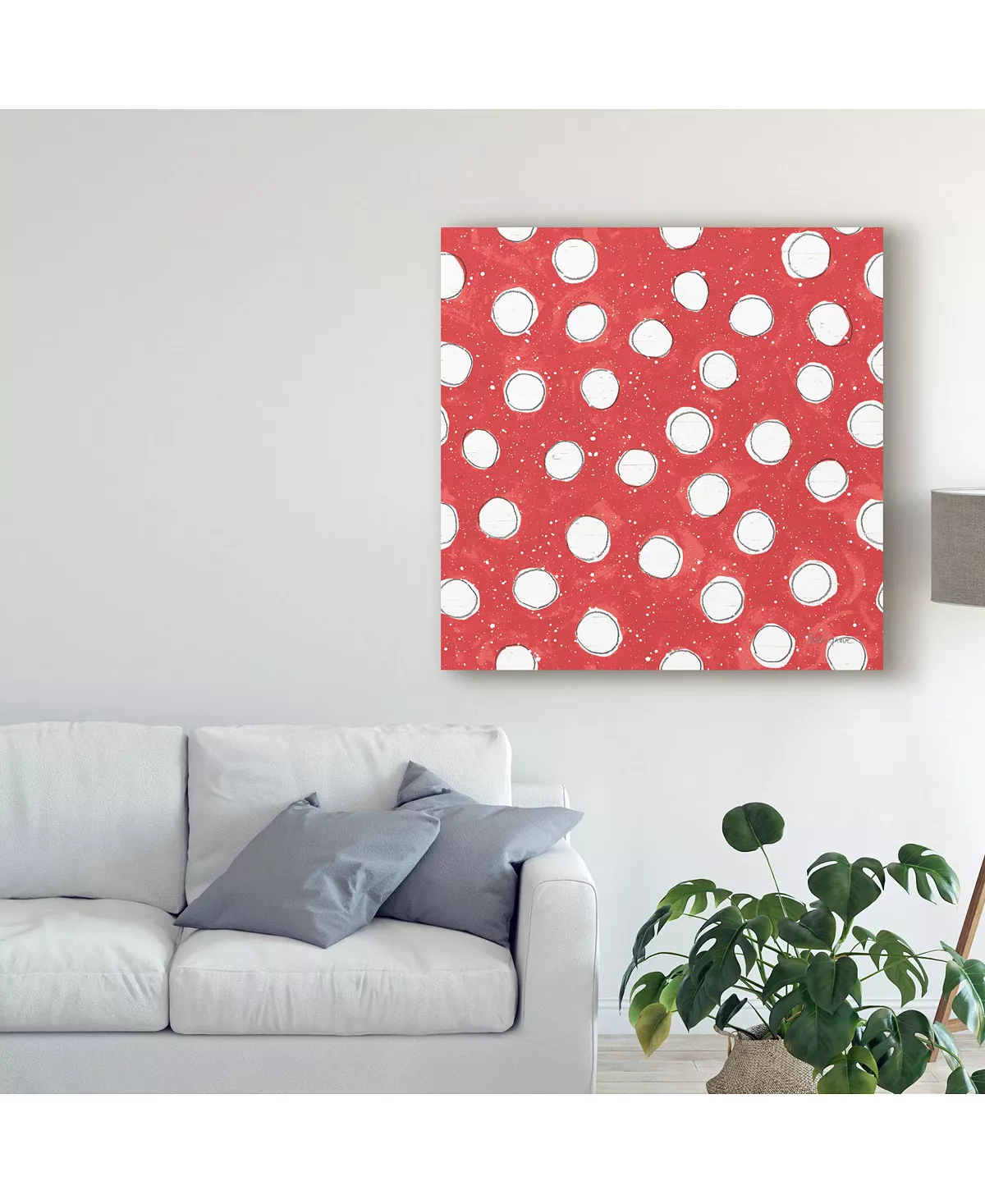 This ready to hang, gallery-wrapped art piece features white polka dots on a red background. Gallery-wrap is a method of wrapping an artist’s canvas around a hidden, wooden frame allowing for a frameless presentation.