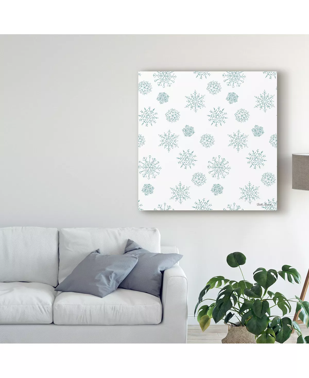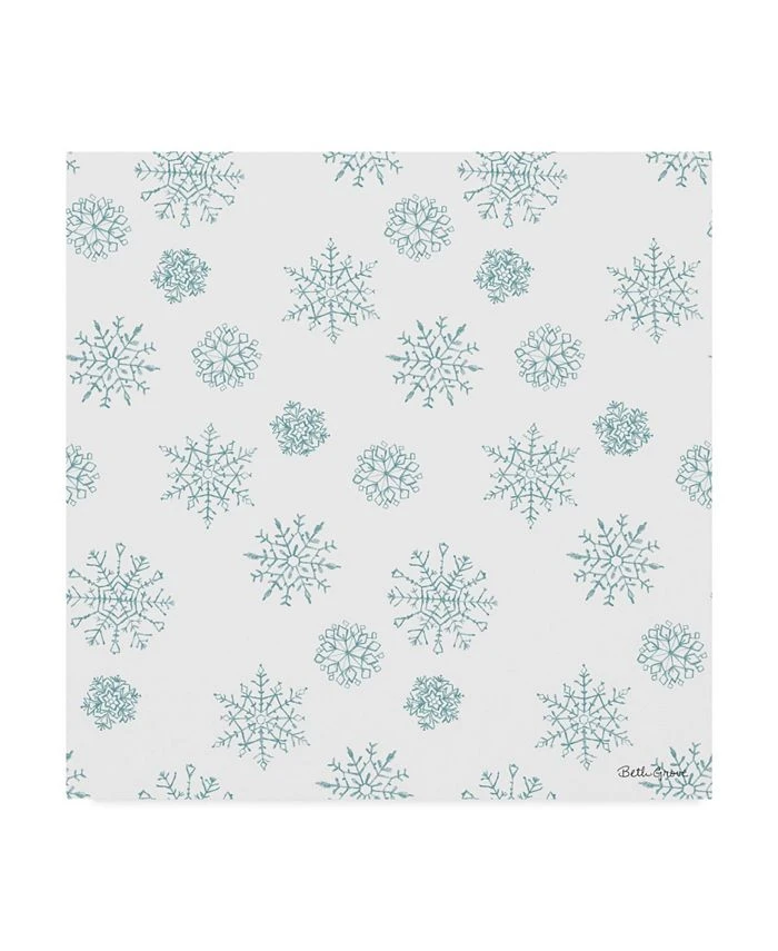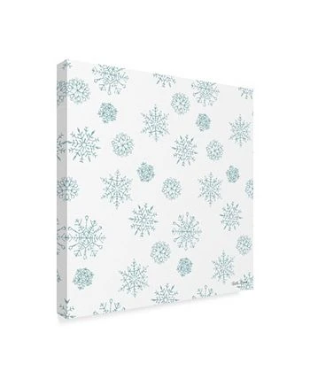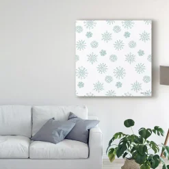 This ready to hang, gallery-wrapped art piece features a pattern of blue snowflakes on a white background. Gallery-wrap is a method of wrapping an artist’s canvas around a hidden, wooden frame allowing for a frameless presentation.