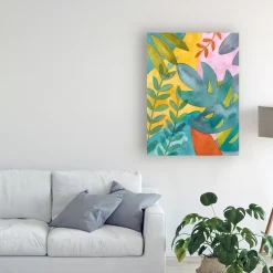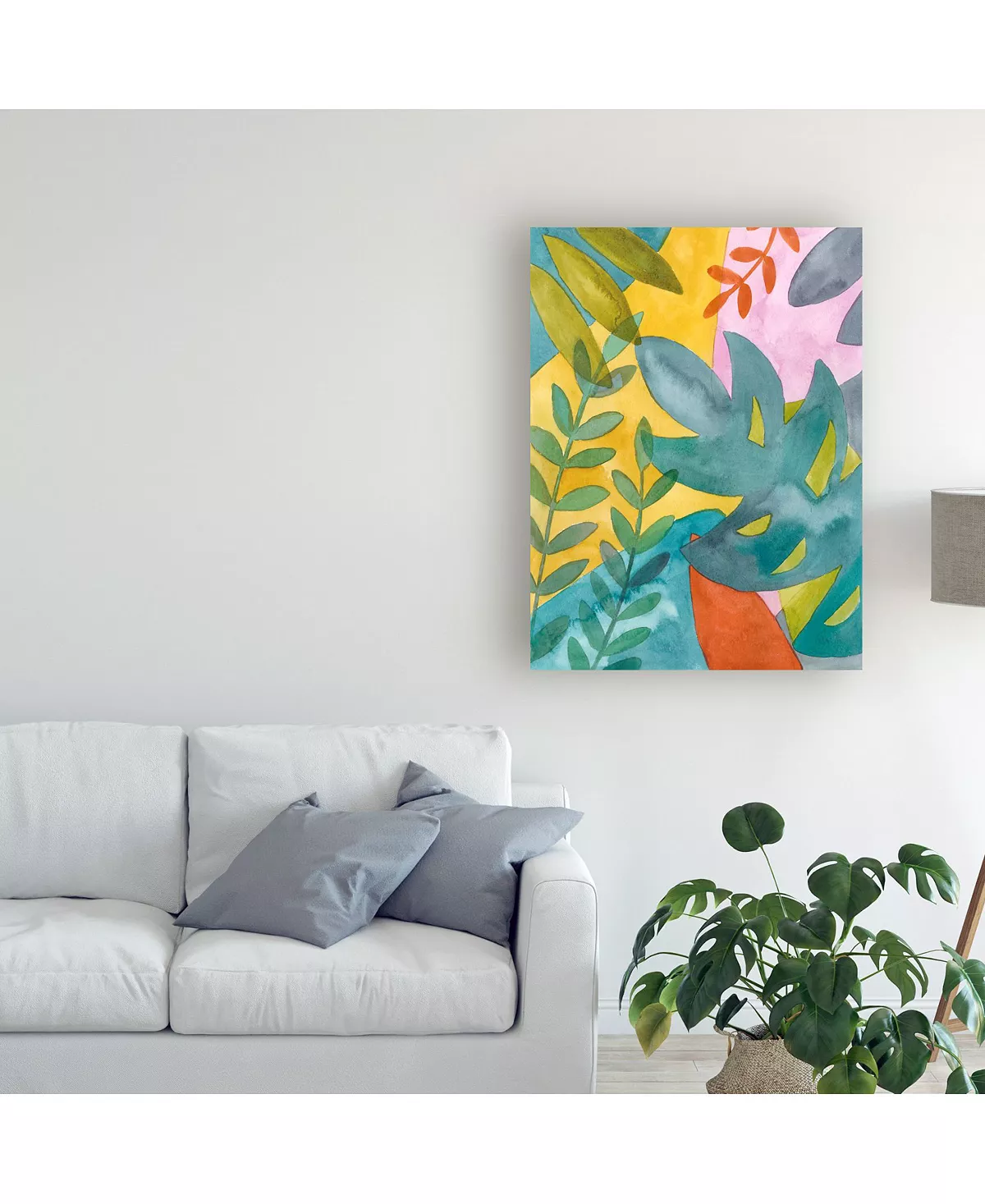 This ready to hang, gallery-wrapped art piece features large tropical leaves over a bright background. Gallery-wrap is a method of wrapping an artist’s canvas around a hidden, wooden frame allowing for a frameless presentation.