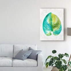 This ready to hang, gallery-wrapped art piece features a blue and green leaf in the center of the frame. Gallery-wrap is a method of wrapping an artist’s canvas around a hidden, wooden frame allowing for a frameless presentation.