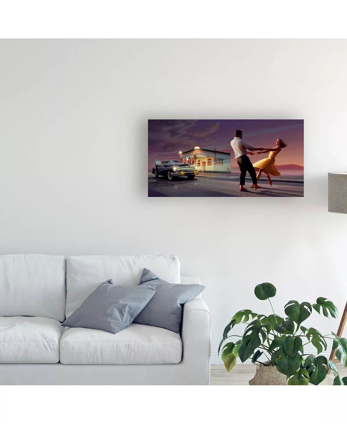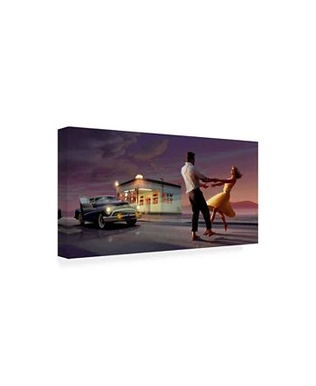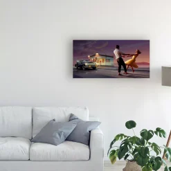 This ready to hang, gallery-wrapped art piece features a couple dancing in a romantic retro scene. Gallery-wrap is a method of wrapping an artist’s canvas around a hidden, wooden frame allowing for a frameless presentation.