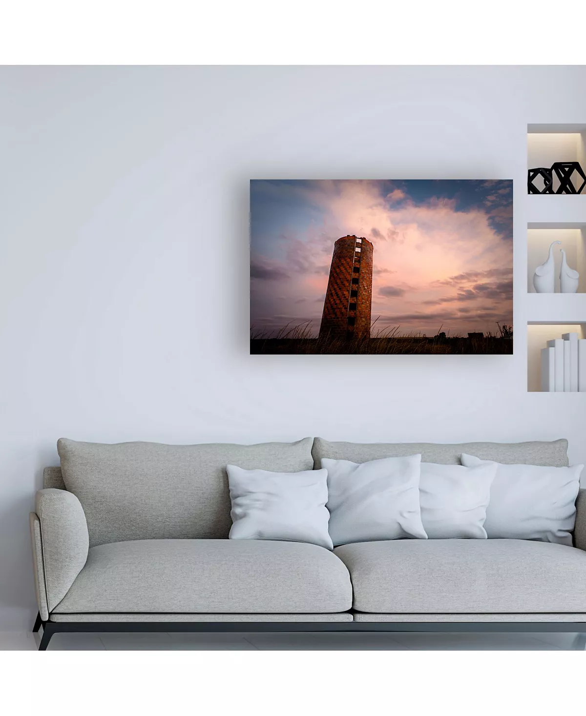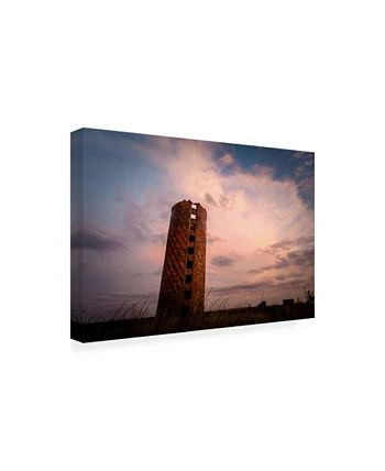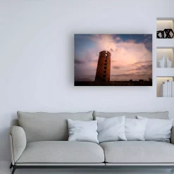 This ready to hang, gallery-wrapped art piece features a tall silo in the center of the frame. Gallery-wrap is a method of wrapping an artist’s canvas around a hidden, wooden frame allowing for a frameless presentation.