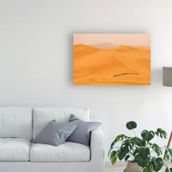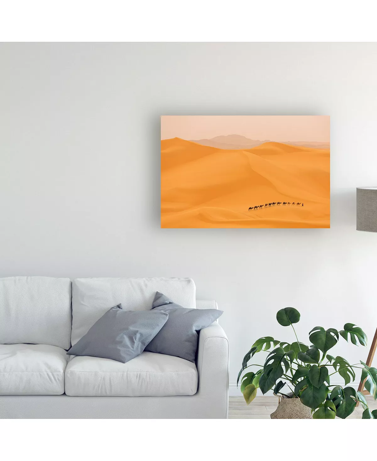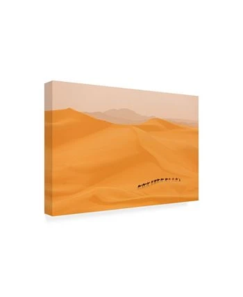 This ready to hang, gallery-wrapped art piece features a row of camels walking along a desert landscape. Gallery-wrap is a method of wrapping an artist’s canvas around a hidden, wooden frame allowing for a frameless presentation.