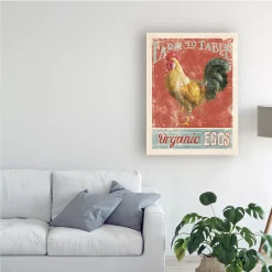 This ready to hang, gallery-wrapped art piece features a rooster standing in the center of a vintage ad. Gallery-wrap is a method of wrapping an artist’s canvas around a hidden, wooden frame allowing for a frameless presentation.