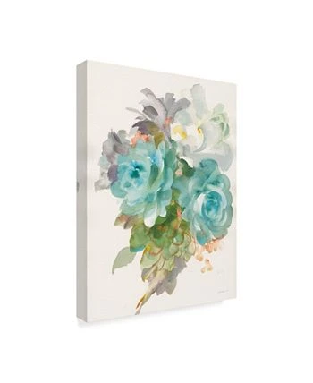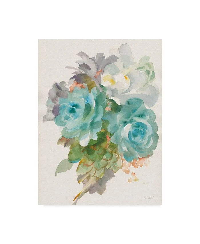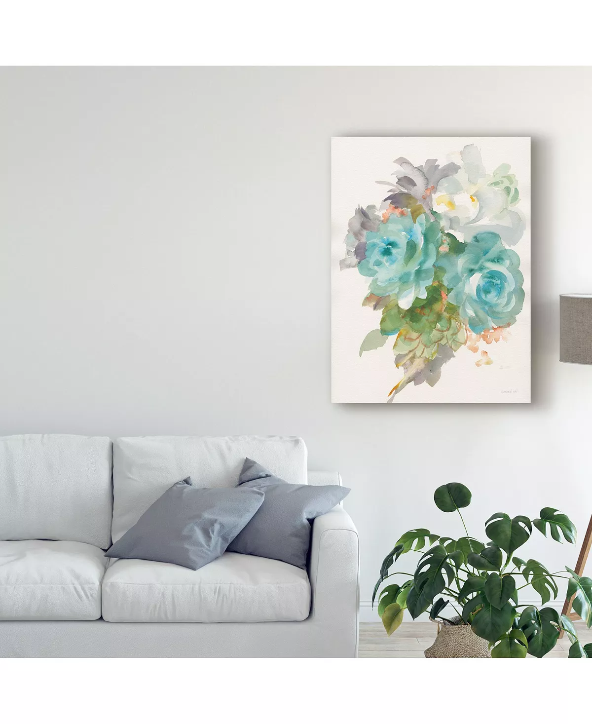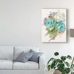 This ready to hang, gallery-wrapped art piece features a group of blue, white, and green flowers. Gallery-wrap is a method of wrapping an artist’s canvas around a hidden, wooden frame allowing for a frameless presentation.