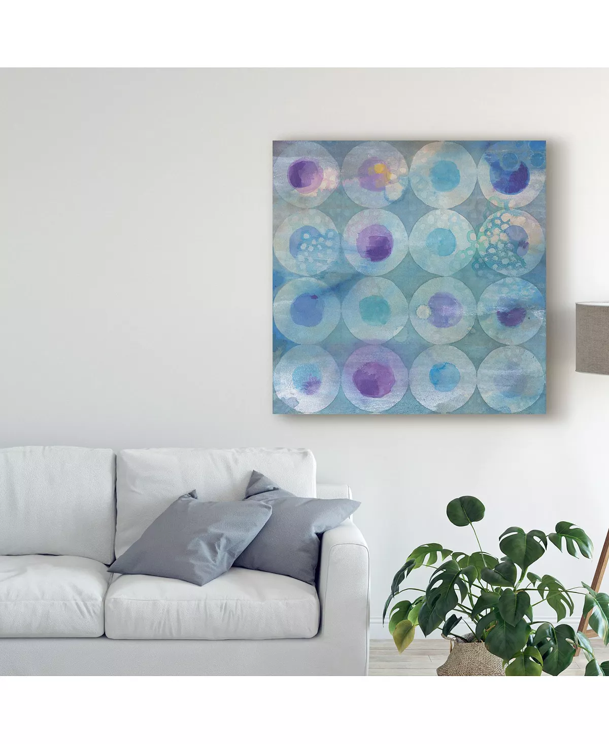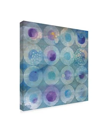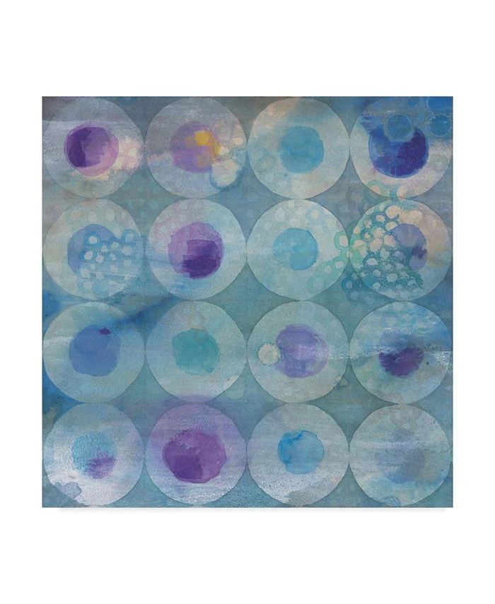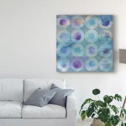 This ready to hang, gallery-wrapped art piece features a grid of blue and purple watercolor circles. Gallery-wrap is a method of wrapping an artist’s canvas around a hidden, wooden frame allowing for a frameless presentation.