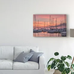 This ready to hang, gallery-wrapped art piece features large sail boats filling a pier under a pink sky. Gallery-wrap is a method of wrapping an artist’s canvas around a hidden, wooden frame allowing for a frameless presentation.