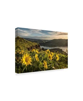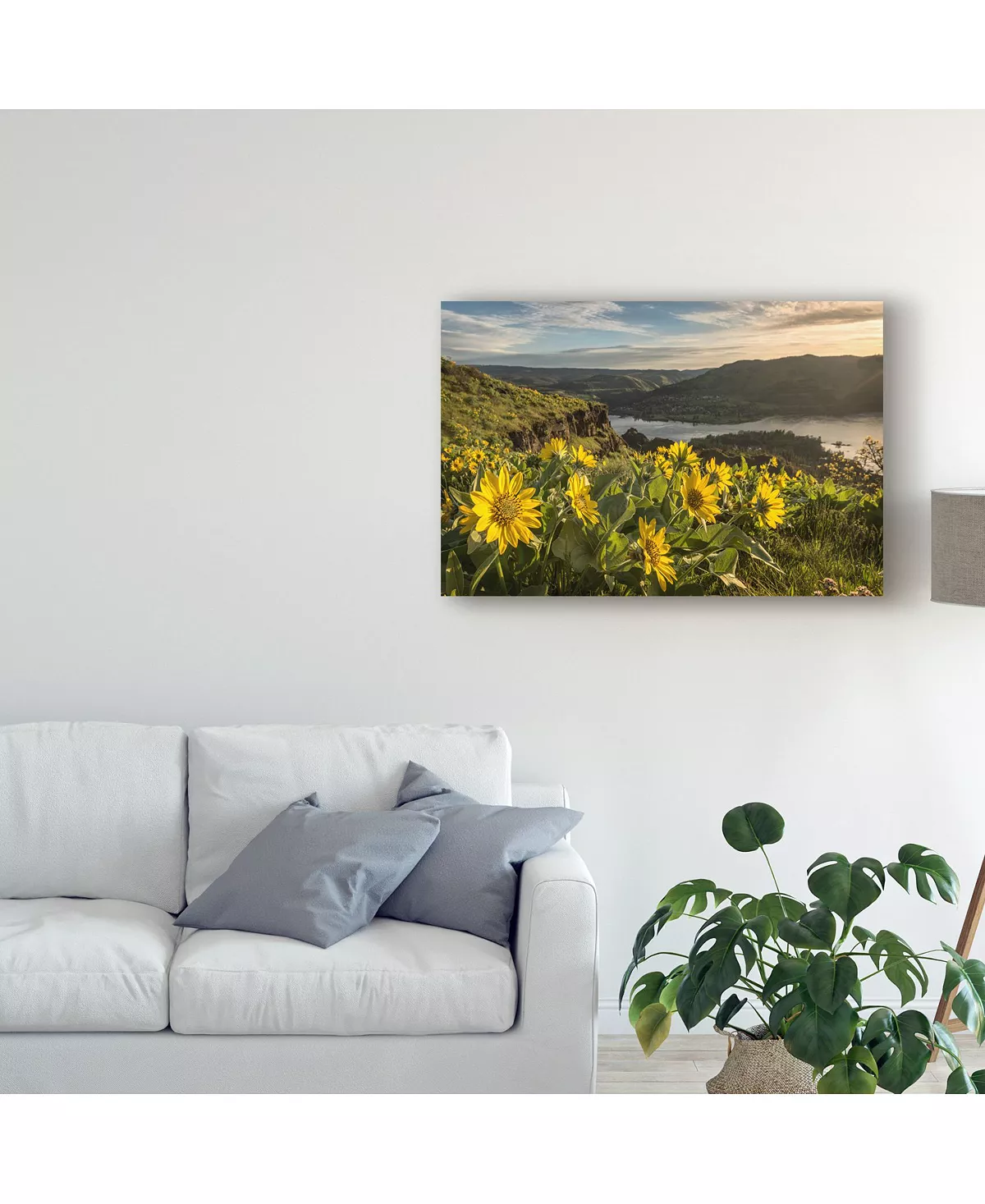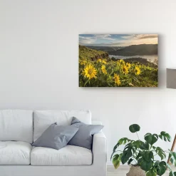 This ready to hang, gallery-wrapped art piece features yellow sunflowers under a cloudy blue sky. Gallery-wrap is a method of wrapping an artist’s canvas around a hidden, wooden frame allowing for a frameless presentation.