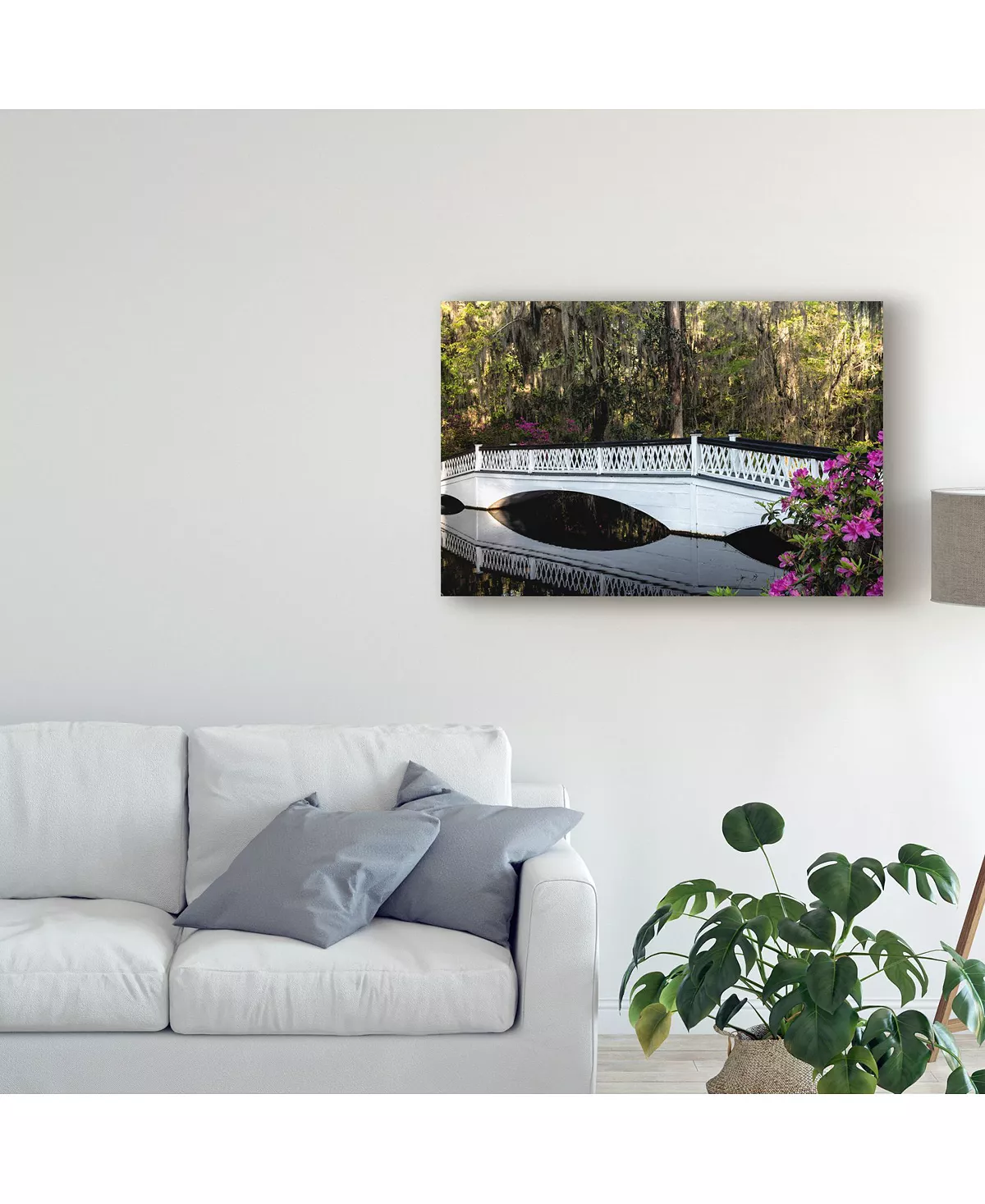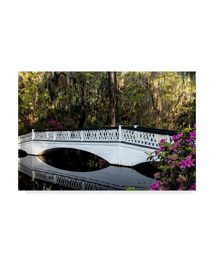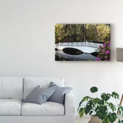 This ready to hang, gallery-wrapped art piece features a white bridge in the center of the frame. Gallery-wrap is a method of wrapping an artist’s canvas around a hidden, wooden frame allowing for a frameless presentation.