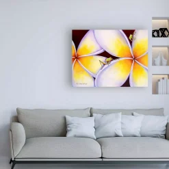 This ready to hang, gallery-wrapped art piece features tree frogs perched on two white and yellow flowers. Gallery-wrap is a method of wrapping an artist’s canvas around a hidden, wooden frame allowing for a frameless presentation.