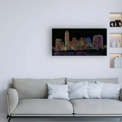 This ready to hang, gallery-wrapped art piece features a colorful line art cityscape filling a black background. Gallery-wrap is a method of wrapping an artist’s canvas around a hidden, wooden frame allowing for a frameless presentation.