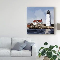 This ready to hang, gallery-wrapped art piece features a lighthouse sitting on a painted coastline. Gallery-wrap is a method of wrapping an artist’s canvas around a hidden, wooden frame allowing for a frameless presentation.